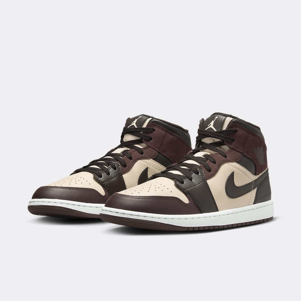 La silhouette semi-montante de la Air Jordan 1 Mid SE Paris YMCA s’inspire du lieu situé rue de Trévise, et en retranscrit les couleurs dans sa construction. La base de l’empeigne est en cuir beige, visible sur la toebox perforée et les panneaux latéraux. Ils s’accordent à la languette en mesh balistique. Celle-ci porte des lacets plats chocolat et une étiquette en cuir assorti, imprimée d’un Jumpman beige. La texture du cuir reprend les chevrons du parquet du mythique terrain et les retranscrit également sur le garde-boue arrière. Son homologue avant est en cuir lisse bordeaux, rappelant le cuir suédé des passages de lacets et du renfort du col de cheville. Ce dernier est gaufré d’un Wings logo et renforce le cuir chocolat du col de cheville. Ce même cuir habille les Swoosh latéraux et contraste avec la semelle intermédiaire immaculée. Une semelle extérieure marron finalise ce design en hommage au plus vieux court du monde.