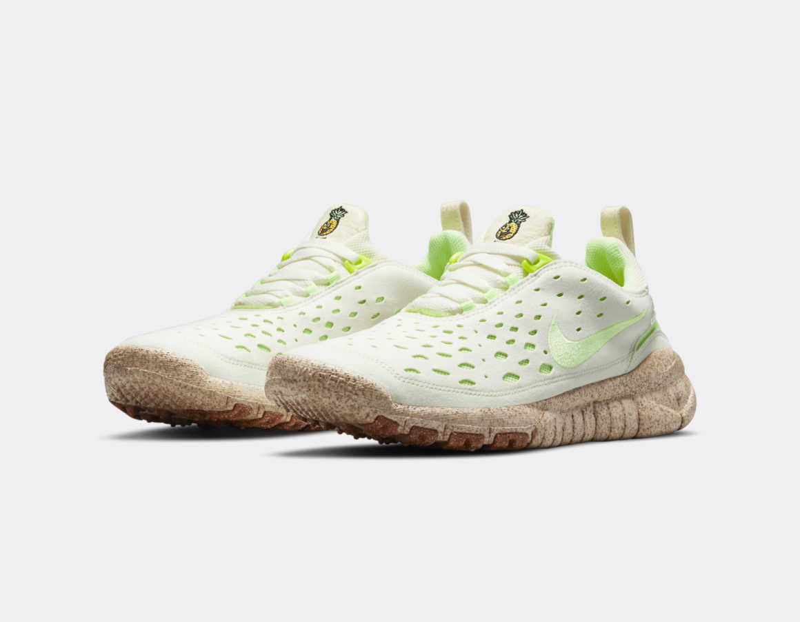 Partie intégrante du programme éco-responsable “Move To Zero” de Nike, cette paire possède une semelle Free Run composée à 15% de liège, ce qui apporte une légèreté supplémentaire à la paire. La semelle beige mouchetée est embossée de l’inscription Nike Free à l’avant et d’un mini Swoosh à l’arrière. La semelle extérieure reprend le même ton avec des touches plus foncées pour marquer les appuis principaux des coureurs. La semelle intérieure est faite également de liège et porte le logo circulaire du programme “Move To Zero”. L’empeigne est quant à elle composée de mesh vert fluo pâle sur la partie inférieure tandis qu’elle est surplombée par du mesh blanc cassé pour la languette et l’encolure de la cheville. La tige est doublée d’un tissu perforé blanc cassé qui s’accorde aux lacets plats utilisés. Un Swoosh latéral vert vient relever le design et un mini Swoosh similaire orne le talon de la paire. L’empeigne est en partie fabriquée à partir de matériaux naturels issus de l’ananas et c’est à ce titre qu’une joyeuse tête du fruit exotique est brodée sur la languette.