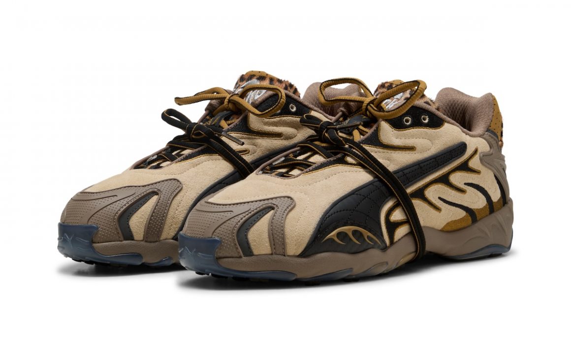 Le design de base de la A$AP Rocky x Puma Inhale Leopard s’inspire de modèles techniques Puma, mais cette déclinaison d’inspiration animale adopte une approche stylistique radicale. L’empeigne mêle cuir premium et suède velouté pour jouer avec les textures. L’imprimé léopard recouvre stratégiquement la languette et le heeltab, oscillant entre des nuances de brun chaud, sable et noir, tandis que des zones neutres, sur le reste de la tige, viennent équilibrer le visuel pour éviter l’excès. Le système de laçage est renforcé, avec un lacet noir, assorti au Formstrip en cuir. La paire repose sur une semelle intermédiaire taupe, ainsi que sur une semelle extérieure translucide et légèrement bleutée.