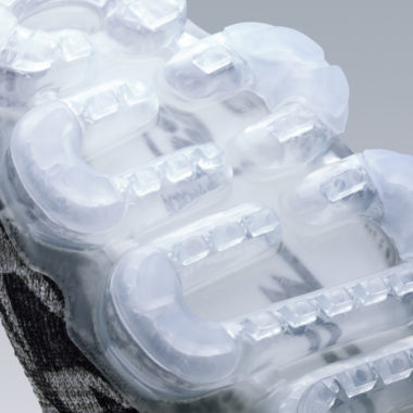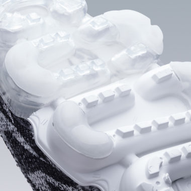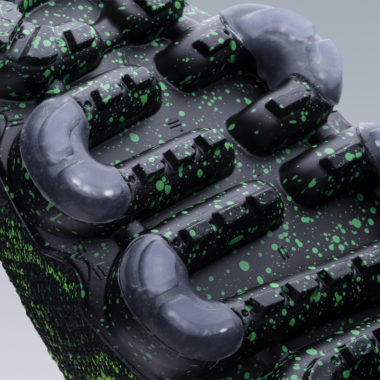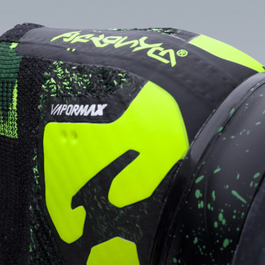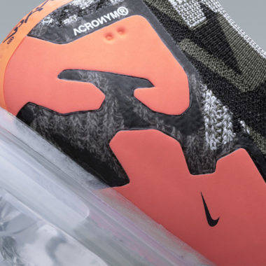 Les deux coloris additionnels sont légèrement plus piquants. On retrouve un modèle « Sail » et un autre, « Black ». Le premier adopte un empiècement marron presque orangé au talon qui capte le regard tandis que le second est un savant mariage de noir et du vert fluo « Volt » caractéristique chez Nike, appliqué sur une grande partie de l’empeigne en Flyknit. Au total, six logos ACRONYM habillent chaque chaussure, dont les formes sur l’empeigne en Flyknit qui comptent comme tel. Ces mêmes motifs évoquent un style camouflage qui s’inspire directement de la lettre A du design de Stash pour le logo « Analog ». Selon les paires, la bulle d’air est apparente comme pour la Sail, ou pas complètement comme pour la Volt. Un choix visuel inédit qui n’aura toutefois pas d’incidence sur le confort unique en son genre apporté par la bulle d’air à 360 degrés.
