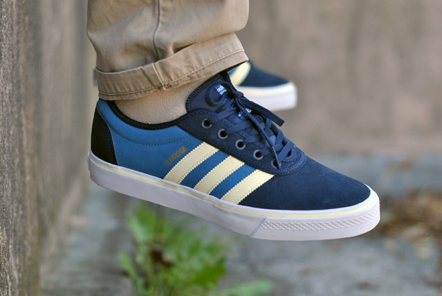 Après vous avoir présenté l’adidas Adi Ease de Benny Fairfax voici aujourd’hui la version dédiée au skateur américain Pete Eldridge. Cette adidas Adi Ease Eldridge mélange plusieurs types de cuir (cuir lisse pour les bandes jaunes, cuir suédé pour les parties bleues et un cuir buffalo pour l’empiècement à l’arrière de la sneaker). En plus d’avoir son nom imprimé en doré au dessus des trois bandes, on retrouve sur la languette et sur la semelle une image avec le chien du rider.