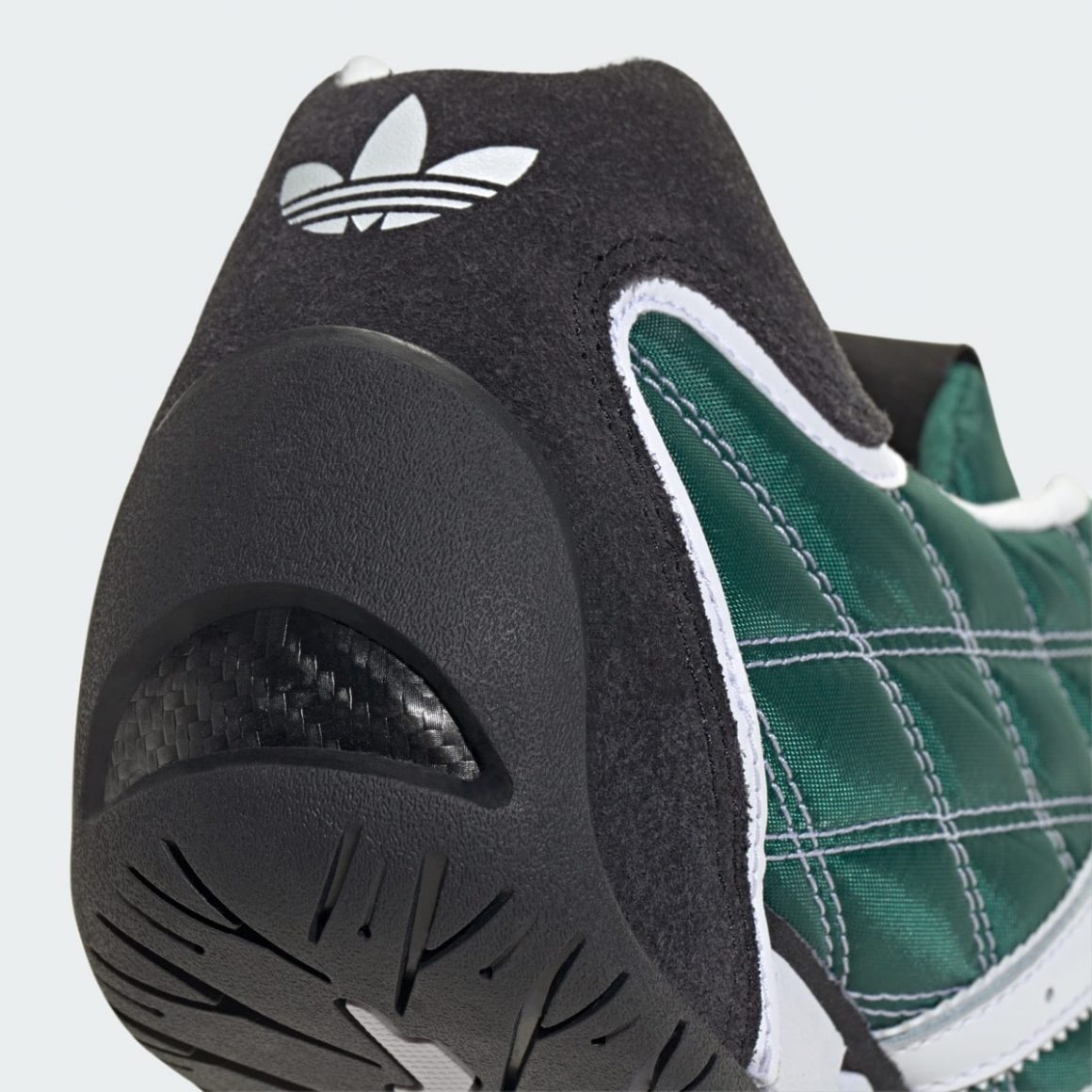 Pour ce retour tant attendu, la firme bavaroise a choisi de réintroduire la adidas Adi Racer Lo dans trois variations distinctes, chacune capturant un aspect unique de son identité. La silhouette basse et racée de la sneaker possède une empeigne construite en nylon, traversé de coutures quadrillées blanches. Les panneaux latéraux sont cousus de trois bandes blanches et se marient aux logos trèfle présents au sommet de la languette et au talon. Ces deux logos se fondent dans des cartouches noirs, rappelant le ton utilisé sur la semelle extérieure. La déclinaison Collegiate Green présente un nylon vert sapin, qui se marie aux lacets plats. La version Better Scarlet est habillée d’un rouge vif, tandis que l’itération Power Blue se pare de bleu roi. Ces trois coloris possèdent un talon en cuir suédé noir, sur lequel la semelle extérieure vient empiéter, en référence aux chaussures de sport automobile. Elle empiète également sur le quart avant de la paire, où est elle est gaufrée d’un logo adidas immaculé.