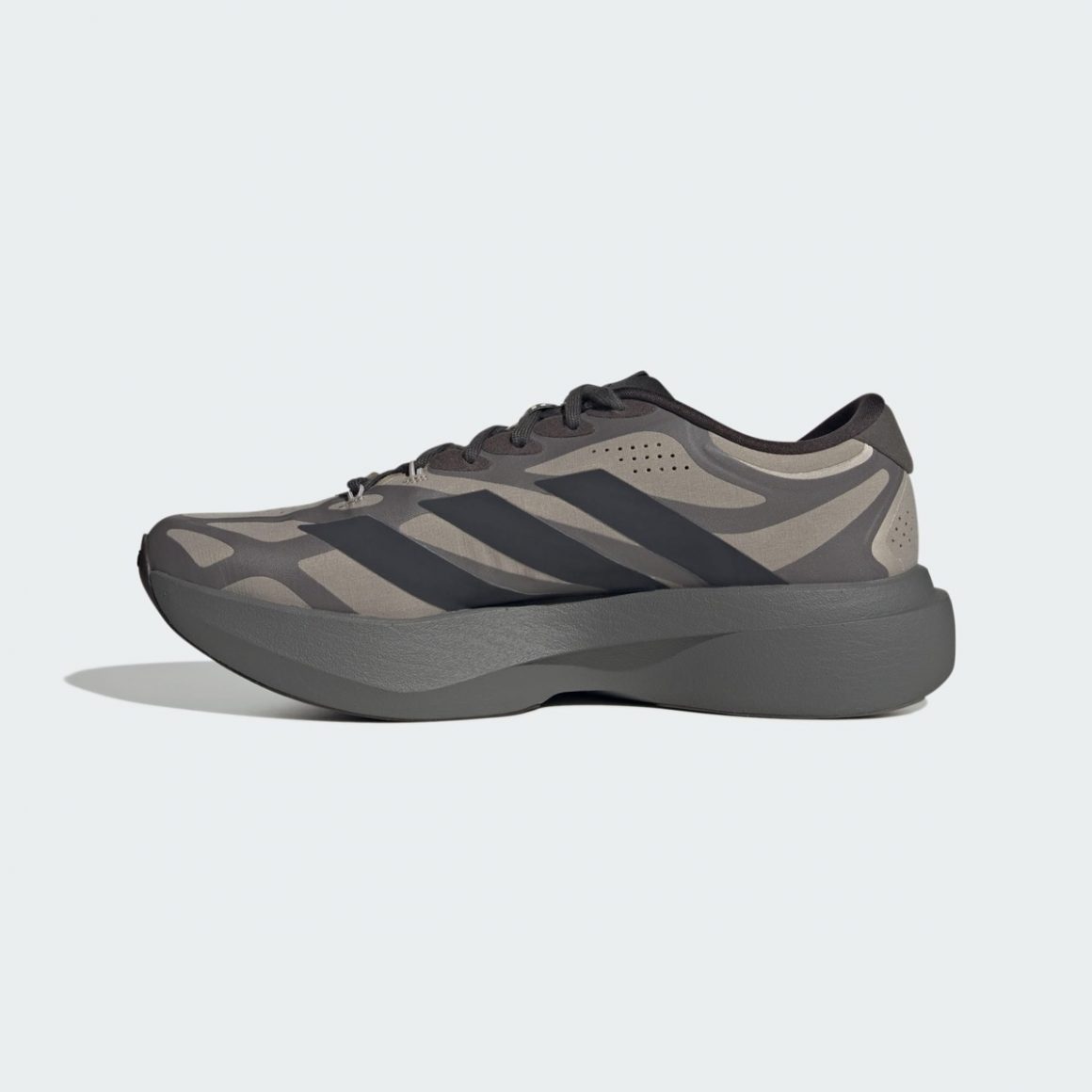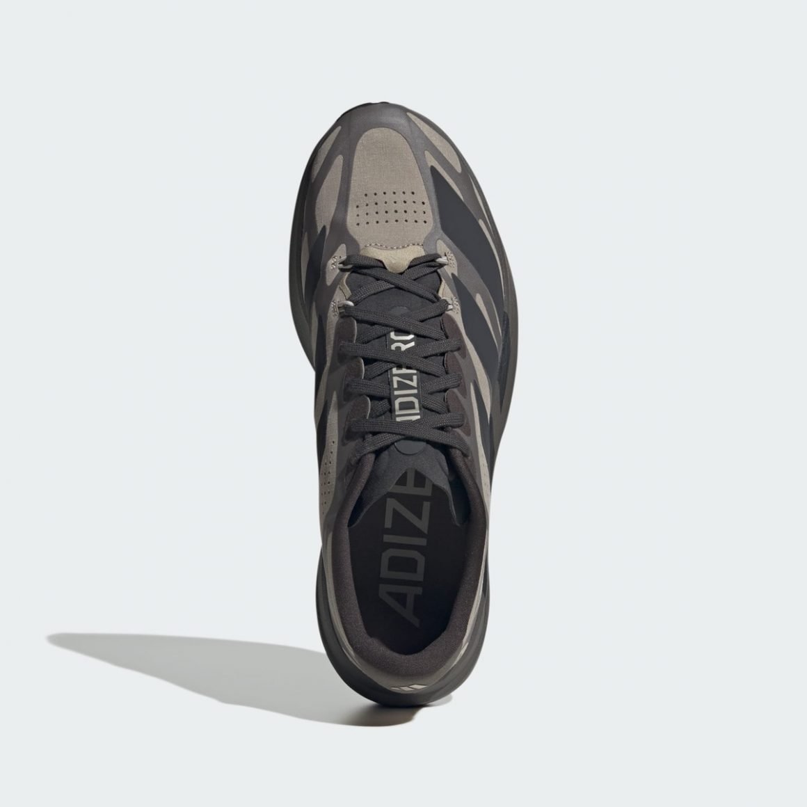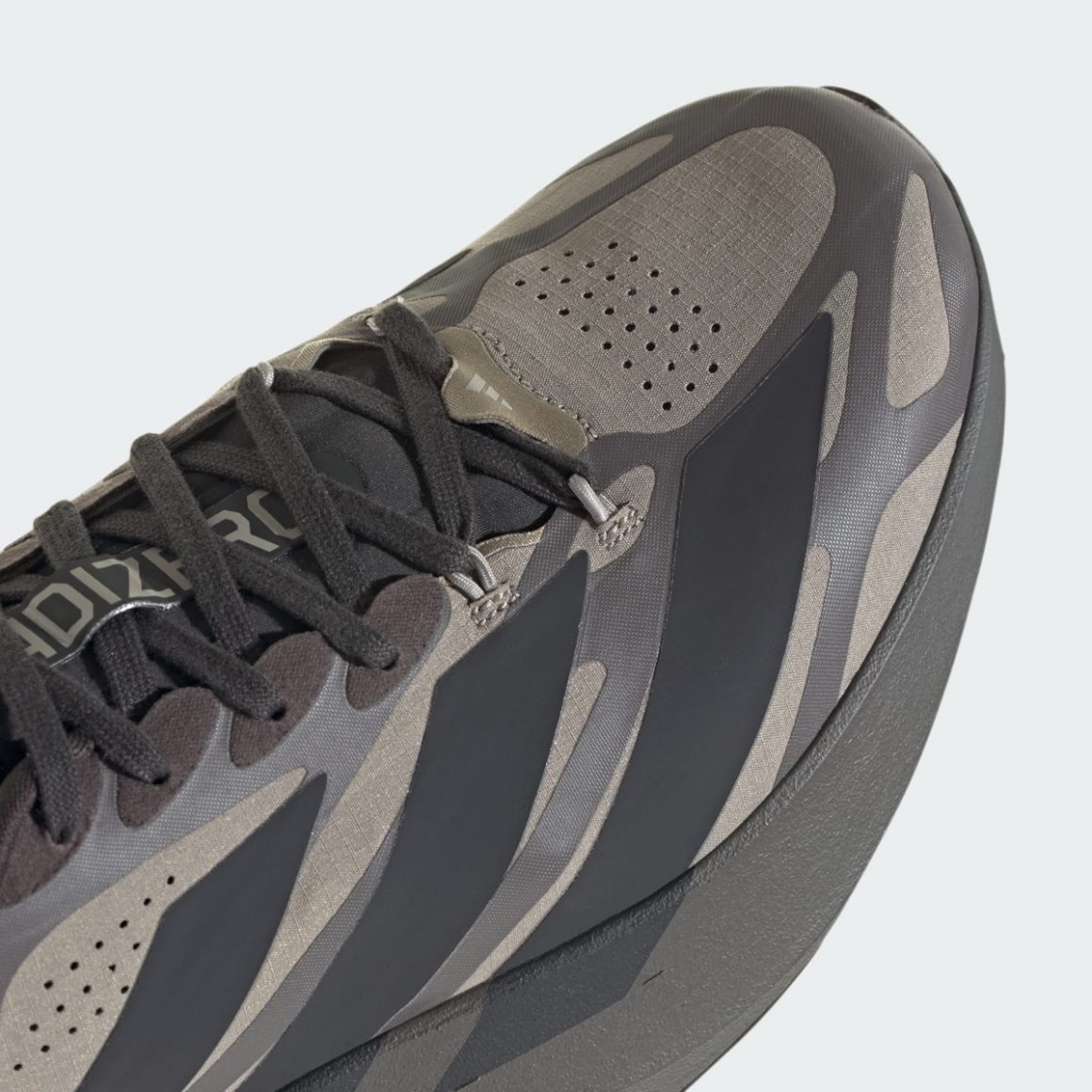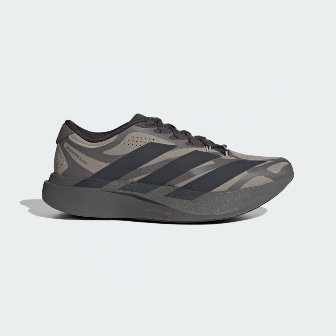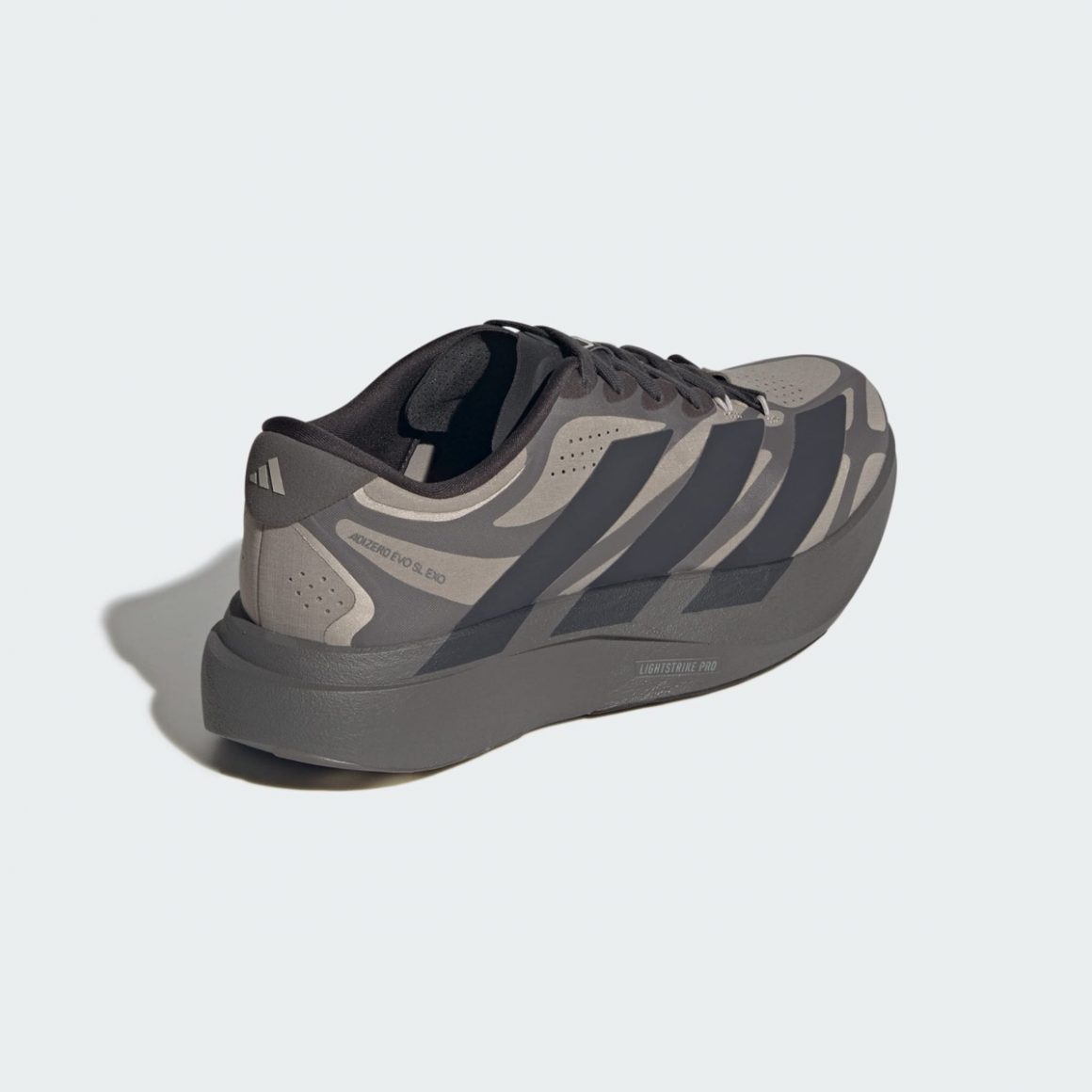 Sur la adidas Adizero EVO SL EXO Silver/Taupe-Black, la tige se pare de taupe, relevé par un exosquelette anthracite. Il rappelle la semelle et contraste avec les trois bandes latérales noires, assorties au sockliner. En contraste, la adidas Adizero EVO SL EXO White/Silver-Black joue sur l’éclat et les contrastes. La base blanche met en valeur les structures argentées de l’exosquelette qui semblent flotter sur le pied, tandis que les touches noires sur les trois bandes latérales viennent ancrer l’ensemble. Les zones réfléchissantes argent donnent une dimension premium, presque de haute couture, tandis que le traitement du mesh et du tissage fin révèle une texture élégante au toucher.