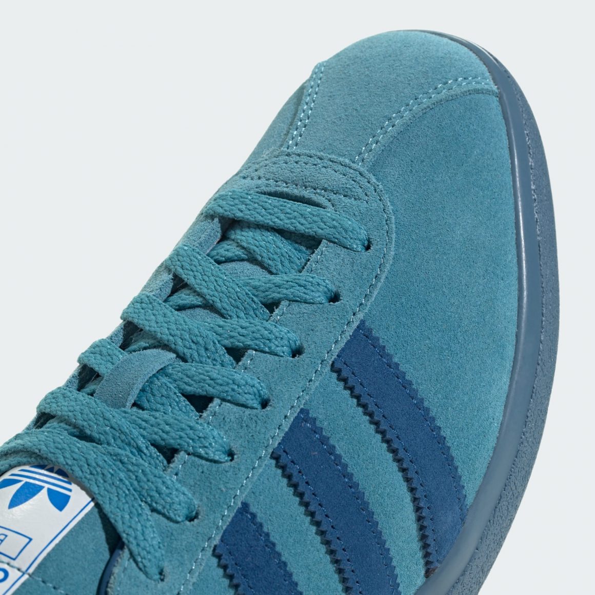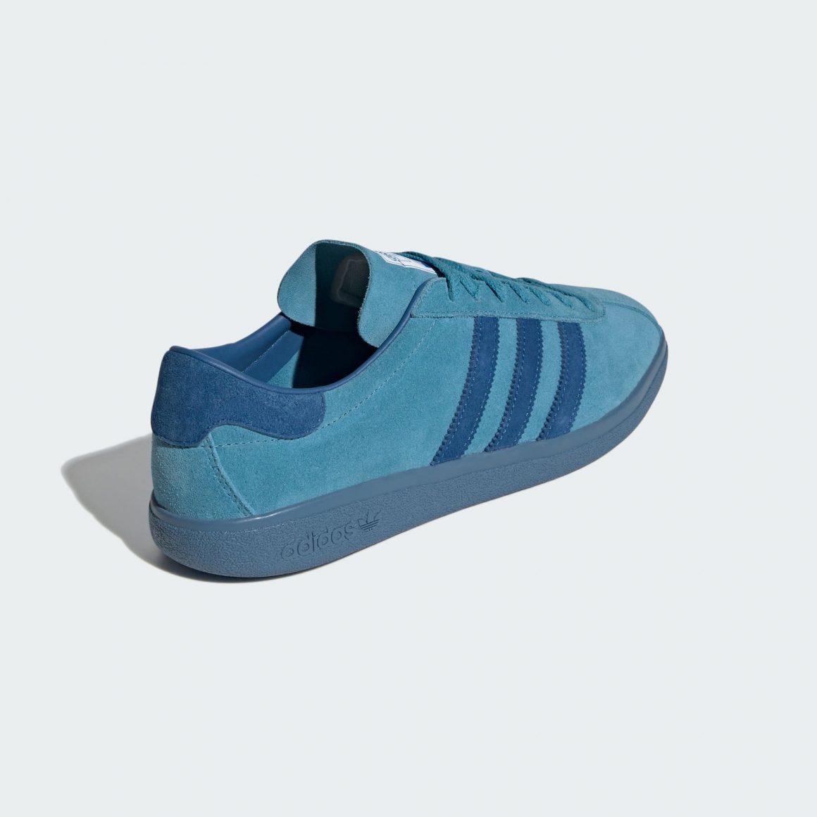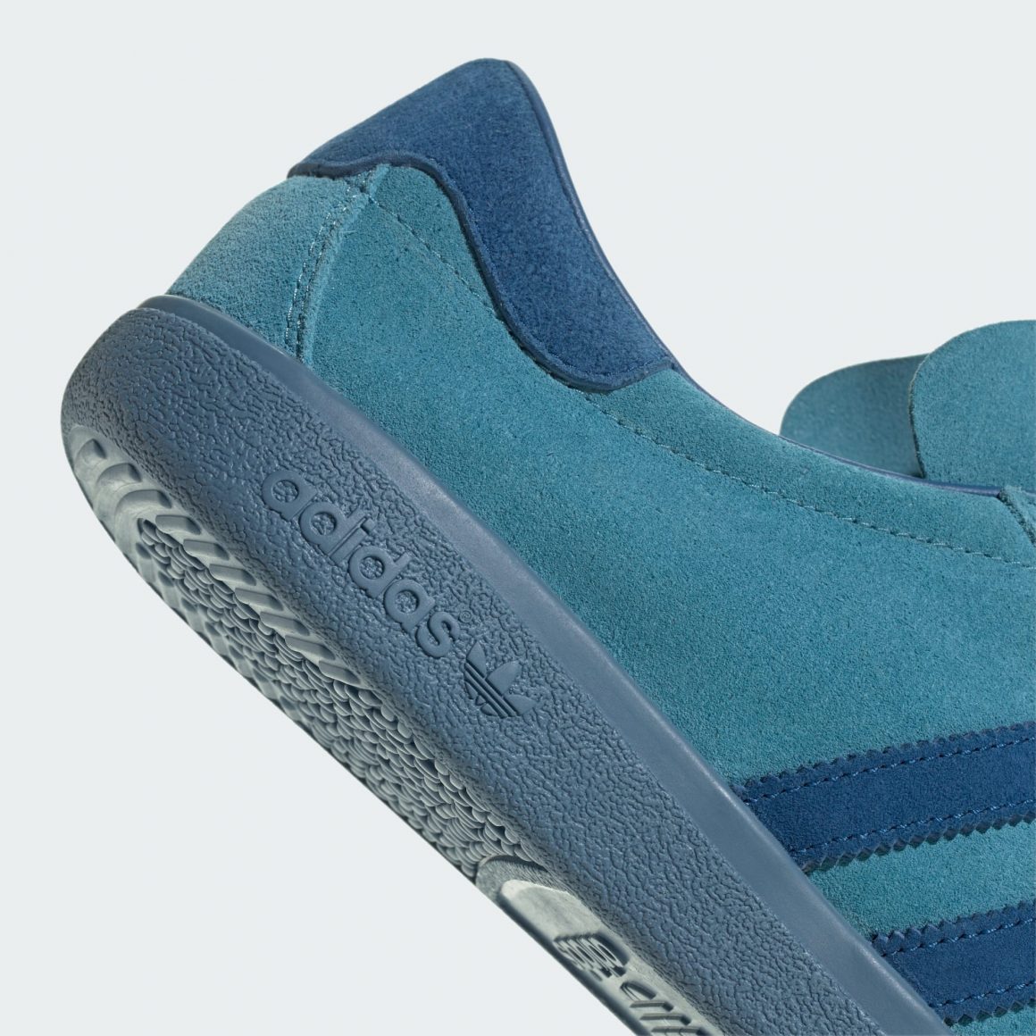 Près de cinquante ans après sa première sortie en 1977, la adidas Bali revient dans le coloris Tactile Steel. Sa silhouette basse s’habille d’un camaïeu de bleus, évoquant la mer entourant l’île indonésienne. Ce combo de couleurs rappellera sans doutes aux passionnés celui aussi utilisé sur l’adidas Tahiti. L’empeigne est en cuir suédé bleu vert, assorti aux lacets plats et à la languette. Celle-ci porte un cartouche blanc, portant un trèfle bleu, ainsi que le nom du modèle. Pour contraster avec le ton de la tige, les trois bandes latérales se marient au heeltab dans un cuir suédé bleu plus foncé. Il rappelle le sockliner, dont le cuir ajoute du confort à la sneaker. La paire repose sur une semelle intermédiaire bleu pétrole grainée. Elle est embossée d’une inscription adidas, accompagnée d’un trèfle. Une seconde paire de lacets lavande accompagne cette réédition.