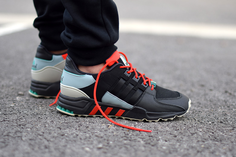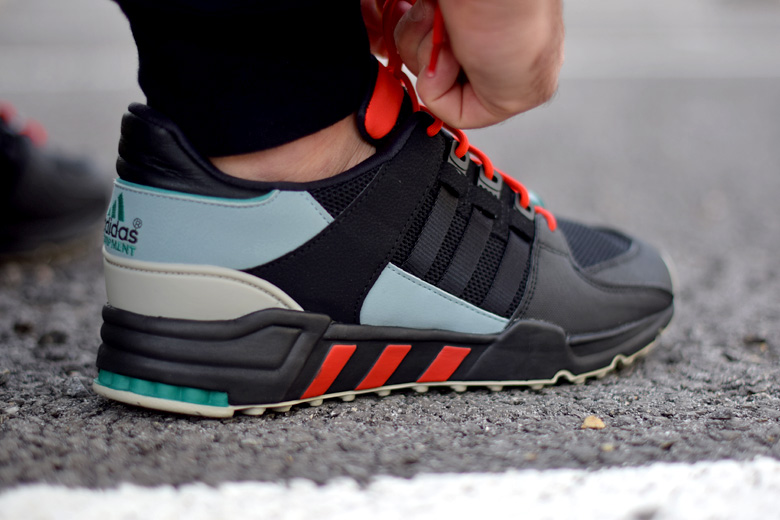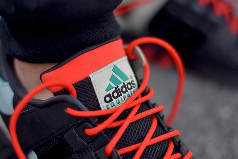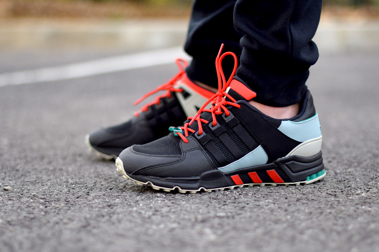La paire arbore d’ailleurs un coloris bien de saison avec une majorité de noir sur l’empeigne et la semelle extérieure. On a d’ailleurs du mal à distinguer les trois bandes du chausson avec ce ton sur ton. Le modèle est confectionné avec du mesh et du cuir. Plusieurs touches de couleurs viennent agrémenter son design : rouge (sur les lacets, languettes et les 3 bandes de la semelle intermédiaire), bleu clair et du vert. Cette dernière couleur est typique de la gamme adidas Equipment, on la retrouve sur les logos, sa boite etc.