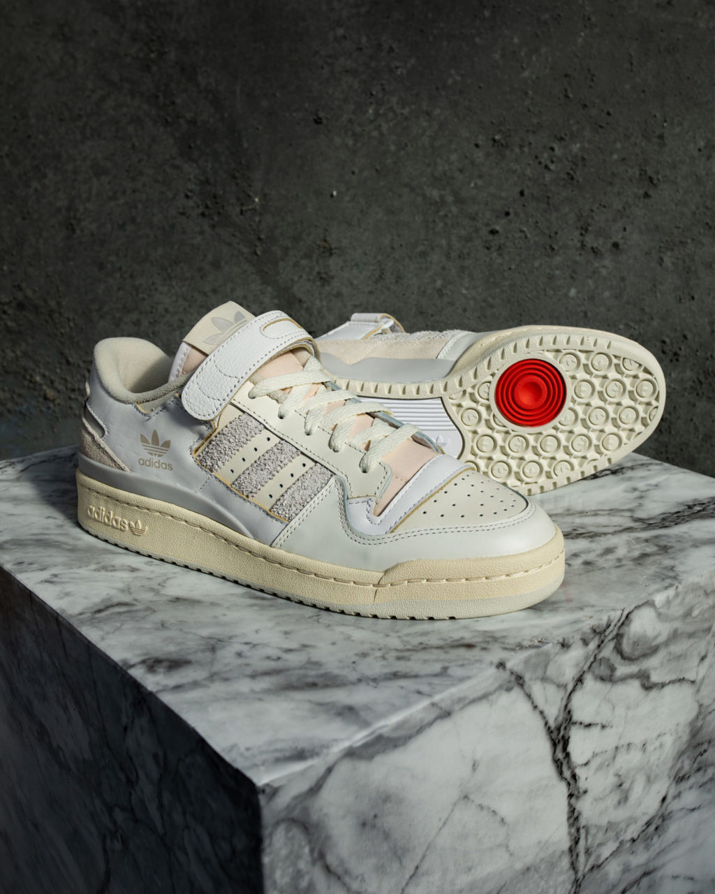 La silhouette de la Forum Low concentre à elle seule le style des années 80 et sa construction représente la qualité optimale que l’on pouvait trouver à l’époque. L’empeigne est faite de cuir blanc légèrement écru et perforé sur la toebox. Les lacets blanc cassé reposent sur une languette immaculée en tissu et surmontée d’un trèfle écru cousu sur fond blanc. Du hairy suede gris clair se retrouve sur les trois bandes latérales et rappelle le renfort de la semelle intermédiaire au talon. Pour marquer la paire, un trèfle adidas gris est imprimé sur le panneau latéral de la paire. La réelle marque de fabrique de la Forum réside dans le scratch au sommet des lacets pour optimiser l’attache de la cheville pendant la pratique sportive. Ce dernier est en cuir blanc. Autre originalité de la paire, la semelle se décompose en trois parties. La semelle intermédiaire blanc cassé est gaufrée d’un logo trèfle adidas. Sur le côté intérieur de la sneaker, le milieu de la semelle intermédiaire est couvert d’un filet blanc, qui rappelle le Dellinger Web utilisé plus tard sur la Deerupt par exemple.