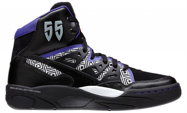 Voici une nouvelle déclinaison de la adidas Mutombo dont le retour est annoncé pour l’automne. La paire est en cuir noir avec quelques dessins en noir et blanc qui devaient rappeler les origines africaines du joueur. Son numéro, le 55, est apposé sur la cheville.