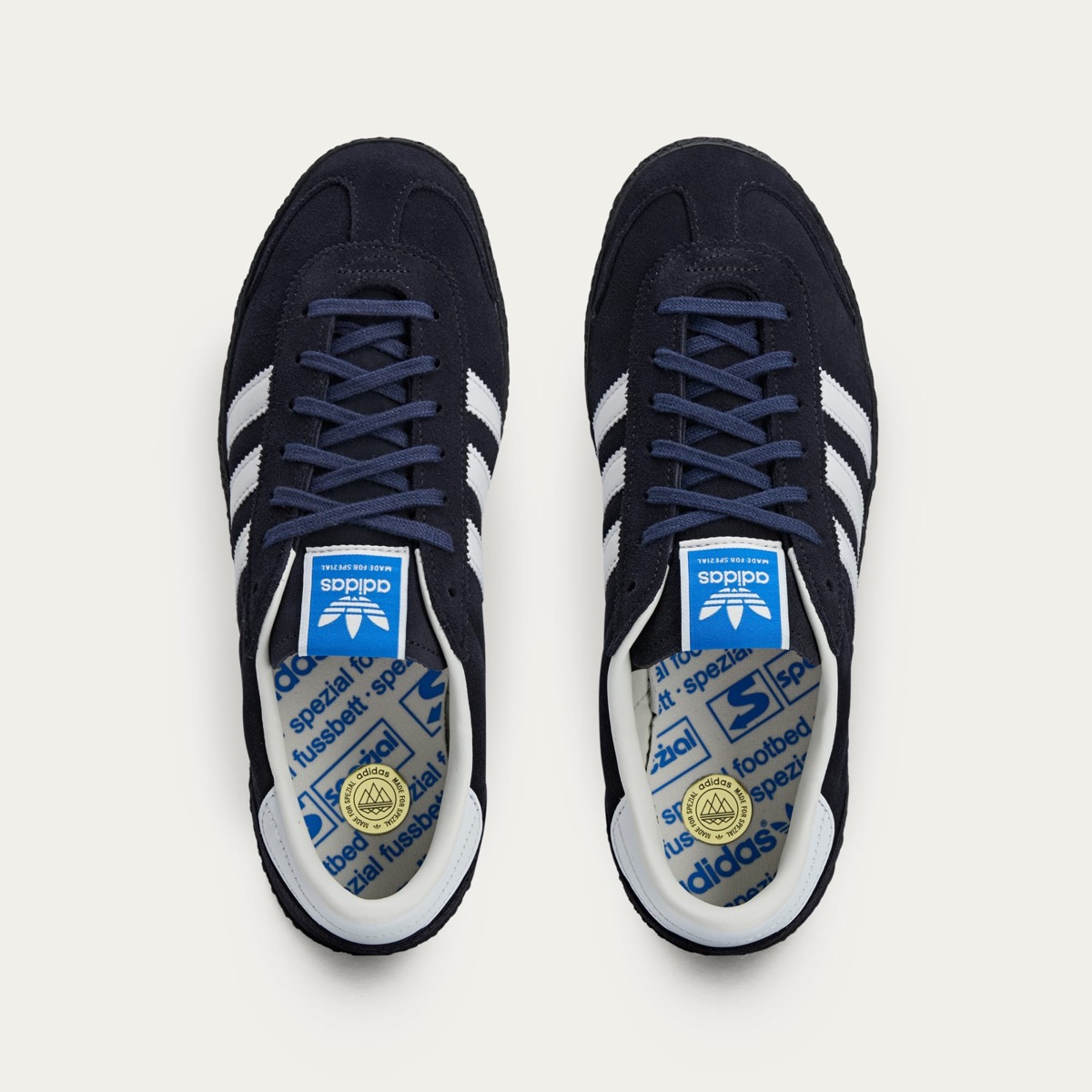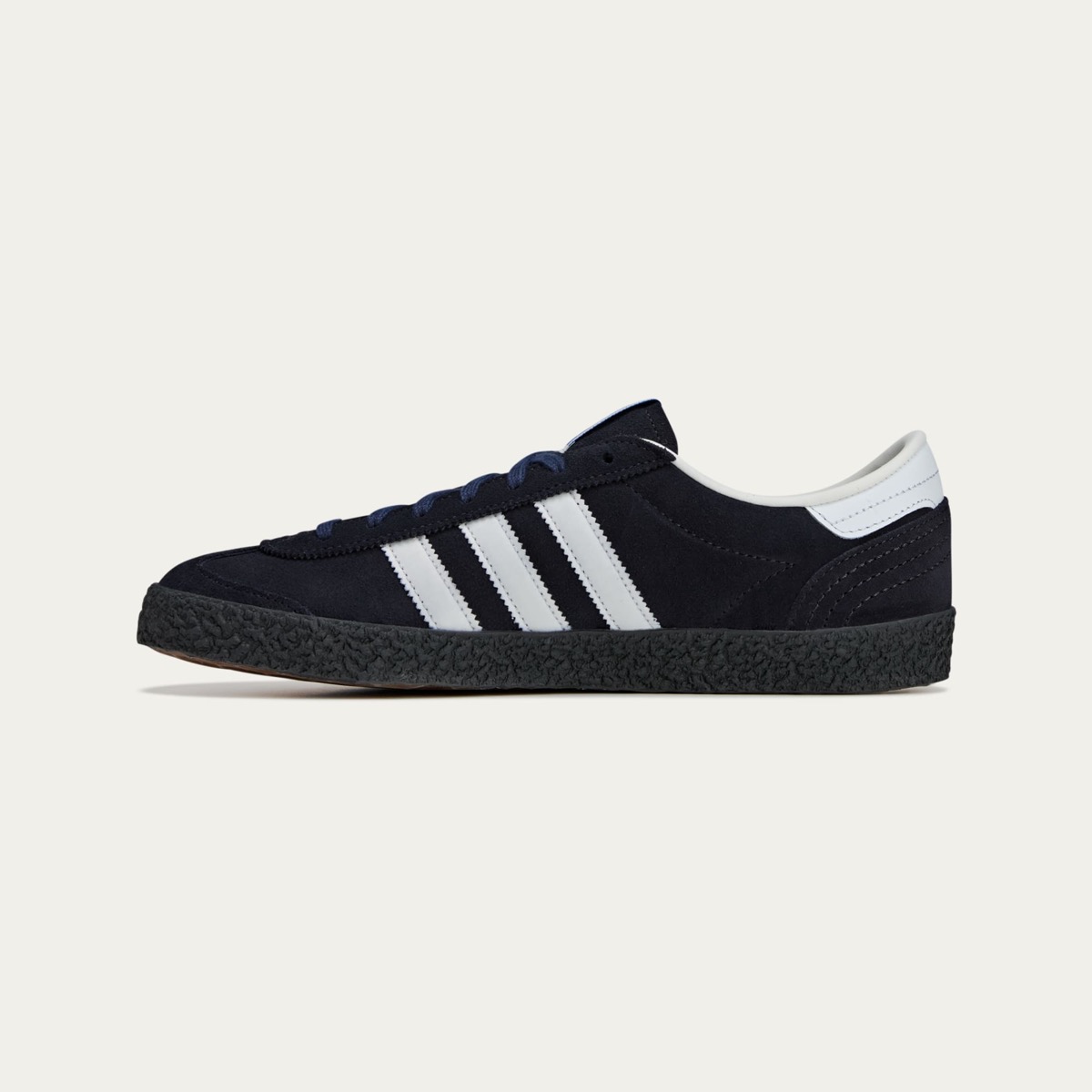 Parmi les paires les plus sobres, la adidas München II SPZL se distingue avec une base en cuir suédé marine profond, relevée par des bandes blanche, assorties au cuir du heeltab. Sa silhouette simple et efficace rappelle l’esprit terrace, intemporel et directement associé à l’histoire du football britannique.