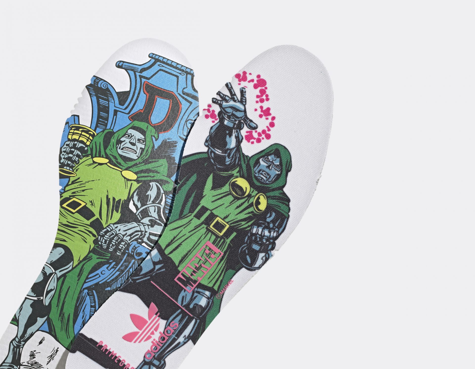 Quand adidas investit le monde du tennis, elle s’associe à Robert Haillet, célèbre tennisman français. La marque au trèfle crée pour lui une paire blanche, épurée et sertie de vert. Celle qui deviendra la Stan Smith conquiert les courts de tennis, ainsi que les pieds des citadins. Longtemps en position d’hégémonie, la Stan Smith a influencé la mode sneakers et inspiré la suite de l’histoire que nous connaissons. Parmi les premiers classiques des sneakers, la Stan Smith possède un statut particulier dans le vestiaire, dû à son caractère intemporel. Depuis qu’adidas collabore avec Disney, de nombreux personnages ont eu droit à leur Stan Smith, comme Bambi, Cruella, Kermit ou Yoda. Aujourd’hui, c’est au tour du Doctor Doom d’avoir sa propre paire chez le géant allemand. Le célèbre super-vilain de la série Marvel prête sa cape verte pour une nouvelle revisite du classique du trèfle, que nous vous présentons ici.