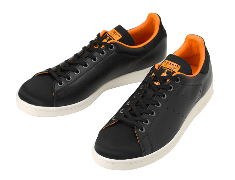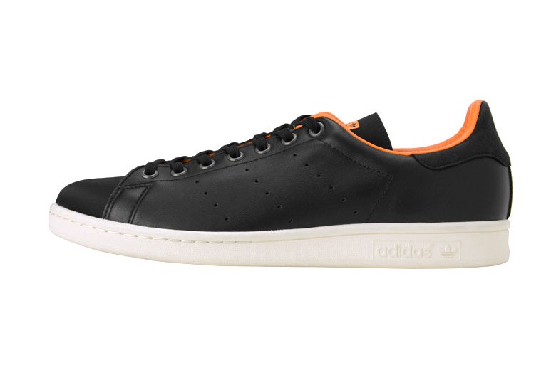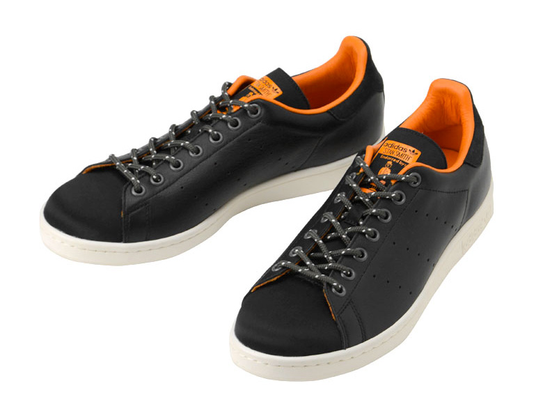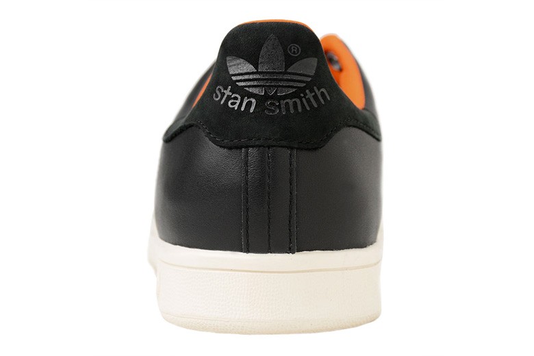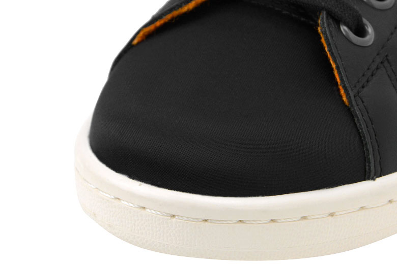 On retrouvera ce même thème appliqué sur cette adidas Stan Smith noir. Celle-ci sera en cuir pour les panneaux latéraux et en nylon pour le toe-box et la languette.
