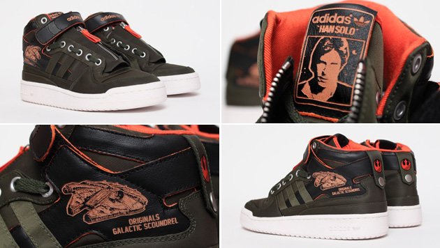 Voici la dernière paire du programme Adidas Star Wars et elle est dédiée à Han Solo. Après 5 saisons, la marque ne continuera pas pour 2012. Le modèle choisi pour cette Han Solo est une Adidas Forum Mid qui reprend quelques aspects de la paire créée par Nom de Guerre (notamment le zip à l’avant mais on peut l’enlever). Découvrez la Adidas Forum Han Solo dans la suite, elle est disponible en ligne sur SNKRS.