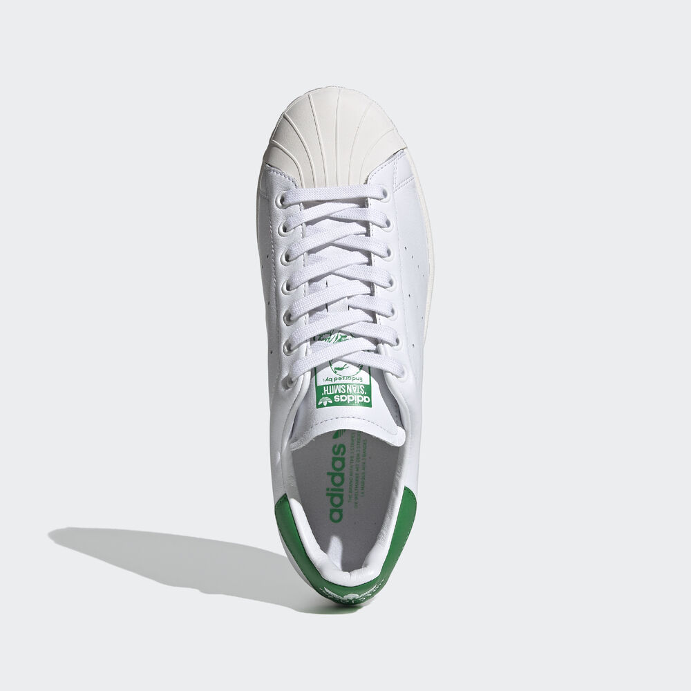 Cette opération marketing très ingénieuse de la part des équipes d’adidas combine l’empeigne classique de la Stan Smith avec la semelle de la Superstar. Le fameux « shell toe », la toebox de la Superstar en caoutchouc, a également été conservé sur cette version revisitée. La paire reprend le coloris blanc mythique de la Stan avec les éléments verts au talon ou encore pour l’étiquette sur la languette qui affiche le portrait du tennisman. L’empeigne est en cuir blanc avec des lacets de même couleur. Sur le côté, les trois bandes adidas sont matérialisées par des perforations multiples, un détail qui traverse les époques.