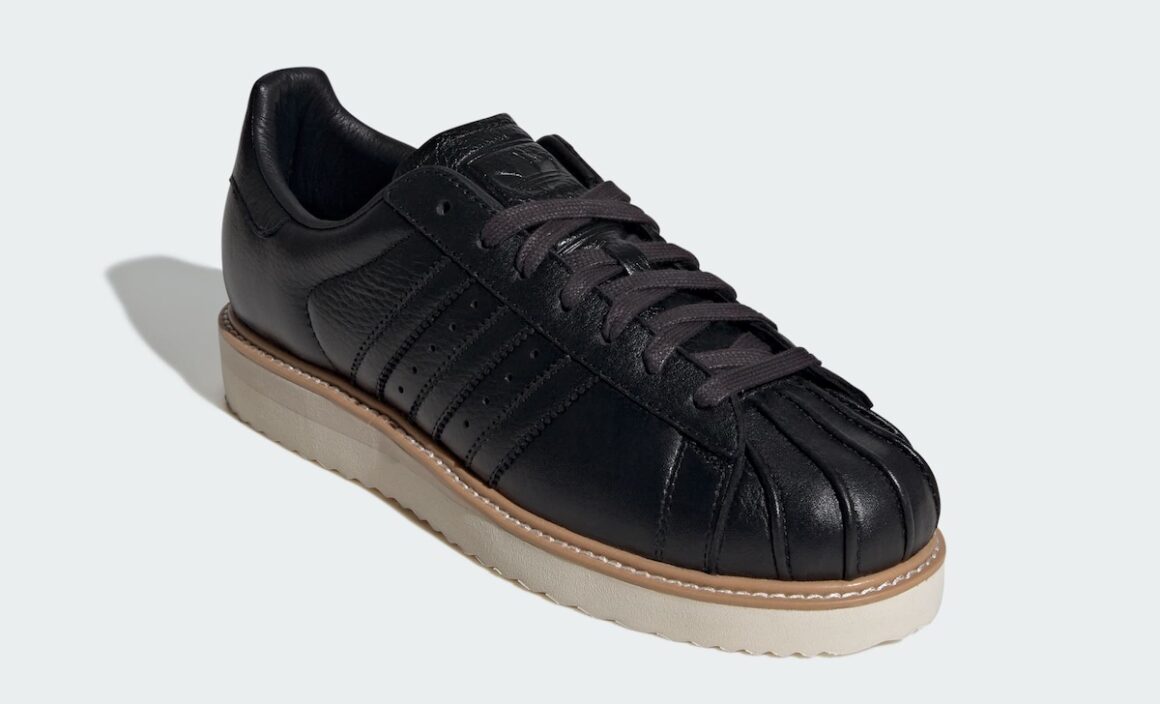 Dès que l’on pose les yeux sur la adidas Superstar Lux, la qualité des matériaux saute aux yeux. Là où la Superstar originale est souvent associée à un cuir lisse fonctionnel, la Lux adopte des cuirs plus riches, plus texturés, parfois même légèrement grainés. Ces peaux premium enveloppent la tige et confèrent à la sneaker une profondeur visuelle et un toucher qui la distinguent d’emblée des versions classiques. La semelle, elle aussi, se voit métamorphosée. adidas a opté pour une base plus généreuse, légèrement épaisse et sculptée, donnant à la paire une allure de soulier moderne. Les détails périphériques, comme les œillets, les renforts et les coutures, sont travaillés avec finesse. Les perforations latérales emblématiques de la Superstar demeurent mais sont ici soigneusement intégrées dans les panneaux, de manière à accentuer l’effet premium. La shell toe, signature iconique de la silhouette, est réinterprétée dans un cuir dense, avec une texture légèrement brillante qui apporte une touche d’élégance. Cette adidas Superstar Lux arrive dans un coloris où la tige noire contraste élégamment avec la semelle crème, liserée de beige.