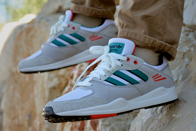 adidas avait ressorti la adidas Tech Super de ses archives au printemps. Elle revient à nouveau cette saison dans un coloris original. La paire mixe des cuirs blanc et gris avec un suédé gris clair sur l’avant et du mesh blanc. Les couleurs appliquées sont typiques du travail de la marque dans les années 1990 avec quelques petites touches de turquoise et d’orange.