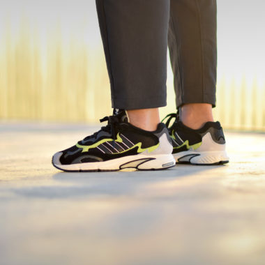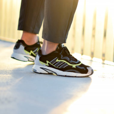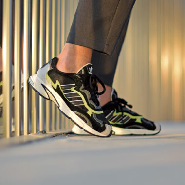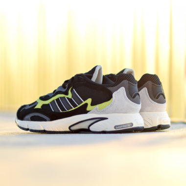 Cette paire fait son grand retour pour cette deuxième partie de saison dans plusieurs coloris. Celui que nous vous présentons aujourd’hui est probablement le plus sobre mais dispose néanmoins de plusieurs détails intéressants. Son coloris assez simpliste est composé principalement de noir avec des touches de gris, dans différentes teintes, et relevé par ce jaune/vert présent sur les empiècements en nubuck disposés à différents endroits sur la sneaker. Le look rétro de la paire est accentué par la semelle assez originale et profilée qui est dotée de la technologie adiPRENE. Les brandings visibles sur la partie extérieure de la paire sont le trefoil en haut de la languette et les trois bandes latérales qui sont presque en ton sur ton.