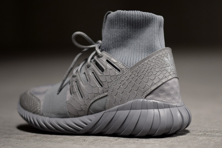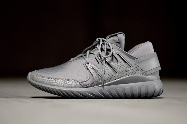 Pour la mi-février, ce sont une adidas Tubular Nova et une adidas Tubular Doom qui seront déclinées avec les mêmes matériaux. En effet, celles-ci disposeront d’une empeigne faite de mesh en nylon associé à des empiècements en matière réfléchissante frappée d’un motif « snake ». Les deux sneakers seront éditées dans un coloris gris pour la totalité du pied.