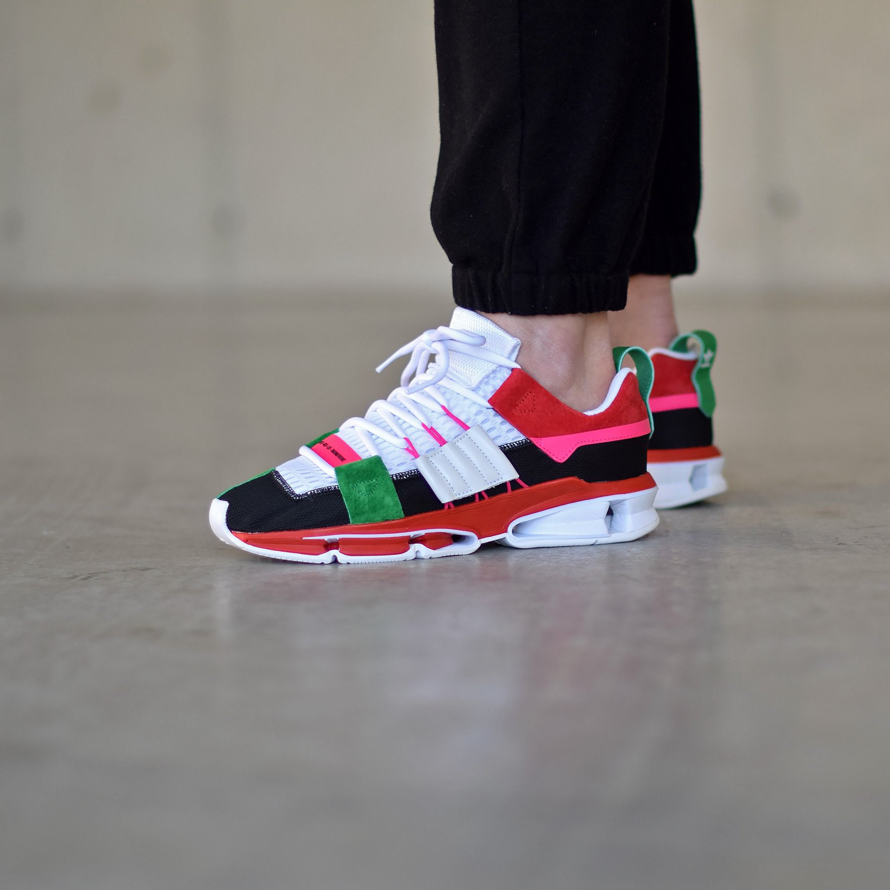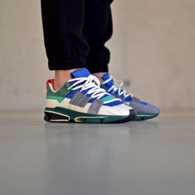 Deux nouveaux coloris complètent la collection Printemps/Été 2018 avec tout d’abord une édition composée de rouge, de noir, de blanc, de vert et une touche de rose. La deuxième paire deuxième mixe du bleu, du vert, du beige et du gris. Chaque association de couleurs semble, à première vue, osée mais le rendu final est très cohérent et colle parfaitement au design original de la sneaker. Côté matériaux, le modèle offre également un large panel de matières telles que du mesh, du cuir, du daim et des empiècements disposés à la manière d’un patchwork. La semelle intermédiaire étonne également par son style si distinctif tout en offrant un amorti et un confort certains. On retrouve le nom du modèle inscrit sur une bande élastique au niveau du cou-de-pied.