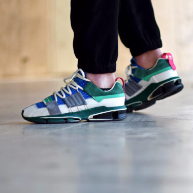 Deux nouveaux coloris complètent la collection Printemps/Été 2018 avec tout d’abord une édition composée de rouge, de noir, de blanc, de vert et une touche de rose. La deuxième paire deuxième mixe du bleu, du vert, du beige et du gris. Chaque association de couleurs semble, à première vue, osée mais le rendu final est très cohérent et colle parfaitement au design original de la sneaker. Côté matériaux, le modèle offre également un large panel de matières telles que du mesh, du cuir, du daim et des empiècements disposés à la manière d’un patchwork. La semelle intermédiaire étonne également par son style si distinctif tout en offrant un amorti et un confort certains. On retrouve le nom du modèle inscrit sur une bande élastique au niveau du cou-de-pied.