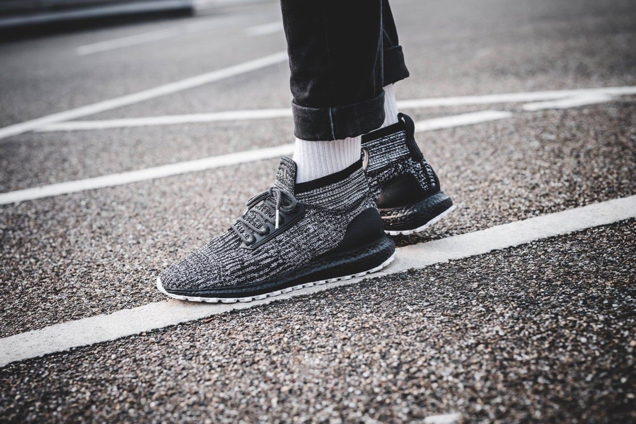 Plusieurs déclinaisons de ce modèle ont déjà vu le jour, mais la principale nouveauté de cette édition réside dans les teintes utilisées. C’est le célèbre coloris Oreo qui a été appliqué ici avec ce mélange de noir et de blanc affichant ce petit effet chiné qui lui va si bien. Autre particularité, la semelle intermédiaire BOOST est colorée en noir et il assez rare de la trouver ainsi. L’empeigne en Primeknit intègre un film de protection imperméable se terminant à la manière d’une chaussette sur la cheville. La semelle extérieure dispose de crans plus prononcés afin d’augmenter son adhérence. Les trois bandes latérales sont, quant à elles, intégrées dans l’empeigne et font office de cage de maintien.