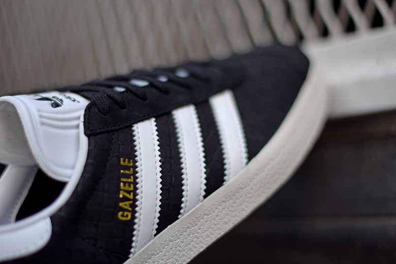 L’adidas Gazelle proposée ici en tailles féminines possède une confection premium. Elle est habillée d’un nubuck noir texturé imitant une peau de serpent et de différents empiècements en cuir blanc. Des couleurs qui font ressortir le logo Gazelle doré. Un traitement de belle qualité très bien réalisé par la marque aux trois bandes.