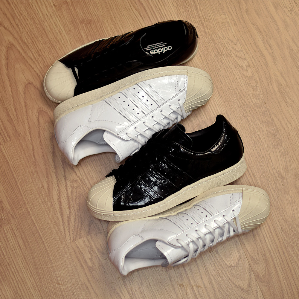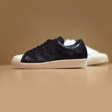Ainsi, pour la collection de la saison Spring/Summer 2017, la belle revient dans un cuir verni légèrement vieilli avec cet effet craquelé plutôt original. Le rendu est très féminin et particulièrement élégant sur la silhouette. C’est l’adidas Superstar 80’s qui est déclinée avec sa semelle légèrement vintage pour un look plus travaillé. Cette Adidas W Superstar 80s Patent Leather est proposée dans une itération blanche et une autre noire. Les deux sont d’ailleurs monochromes.