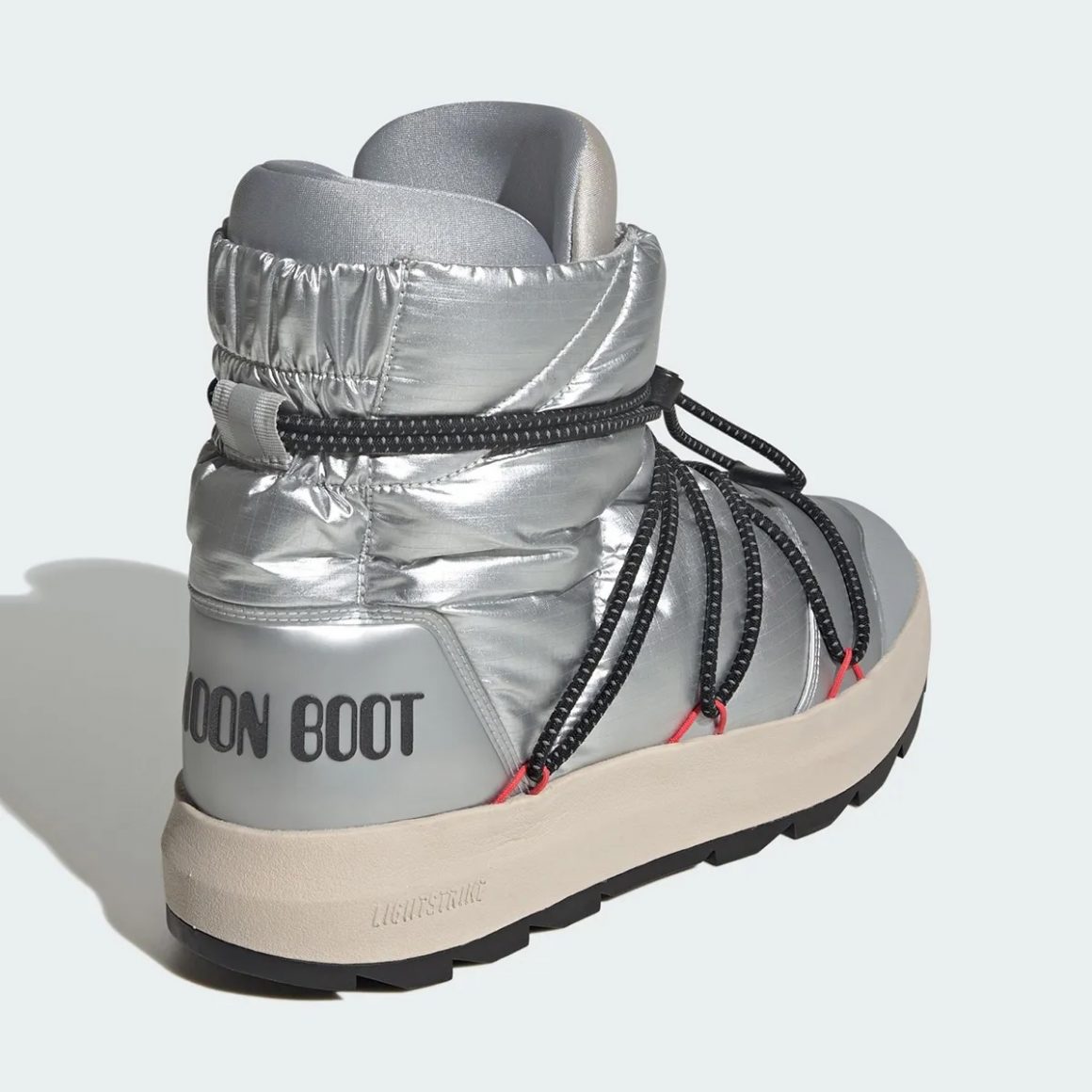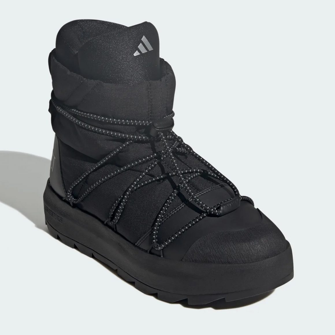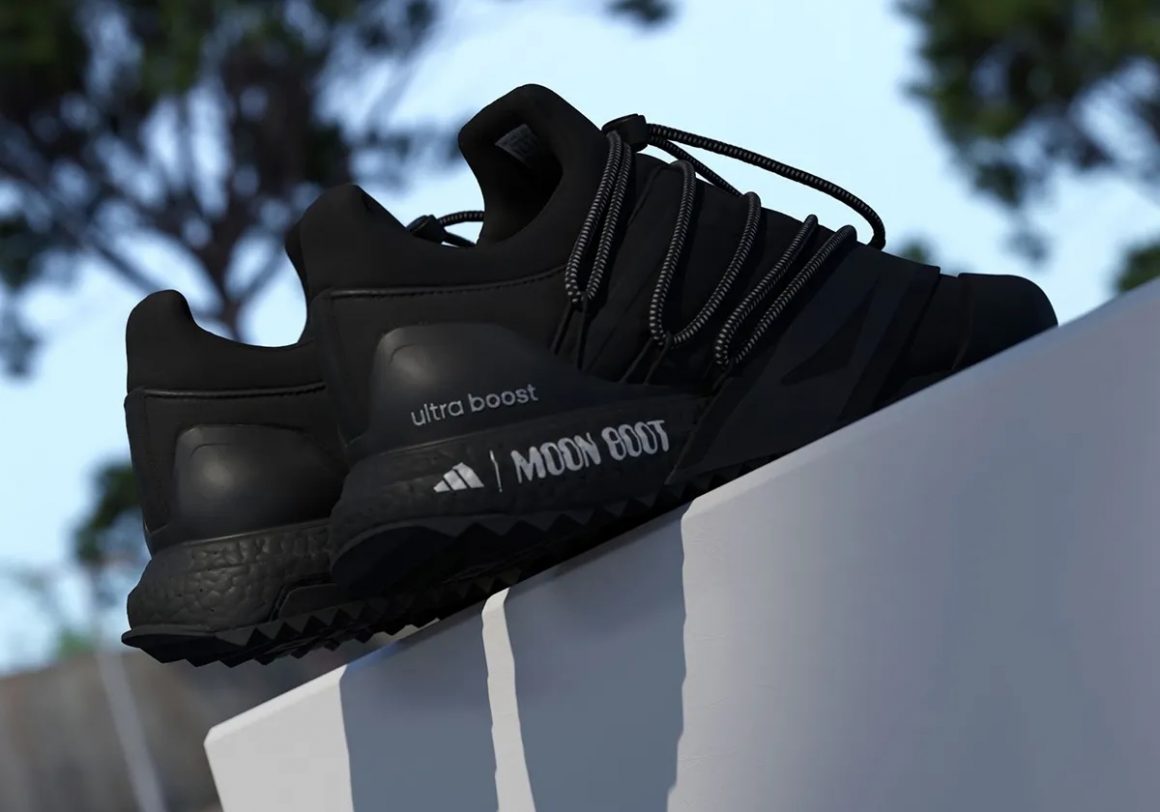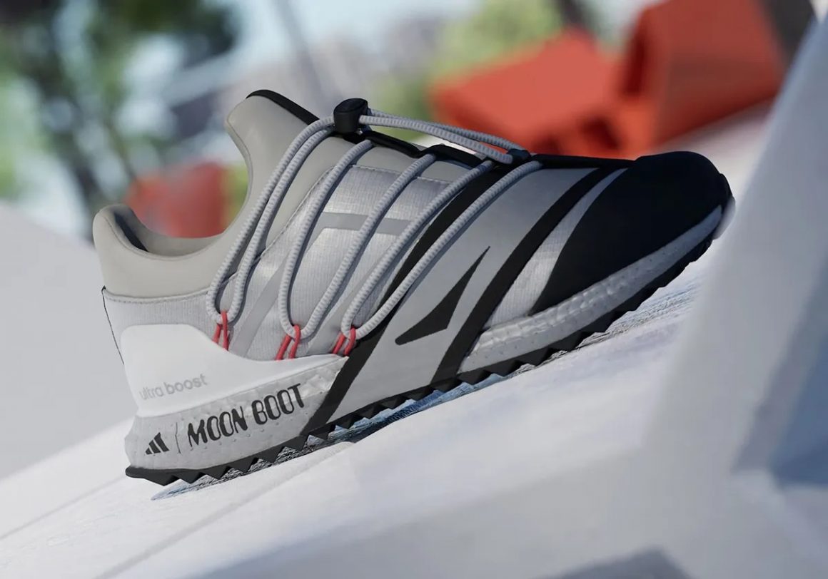 La première pièce de cette collection embarque la technologie Ultraboost : la semelle de la adidas Ultraboost 1.0 x Moon Boot reprend la silhouette de la célèbre running d’adidas, en l’habillant de matériaux imperméables, spécialité de Moon Boot. La toebox est renforcée par une cage en TPU et le système de laçage simplifié rappelle celui des bottes de ski de Moon Boot. La paire se décline en deux coloris. Un premier qui mêle du gris argenté à du blanc et du noir, et un second tout en noir, sublimé par une inscription Moon Boot argentée sur la semelle en Boost.