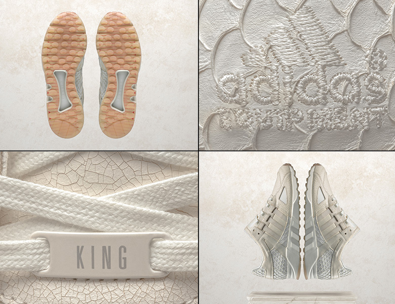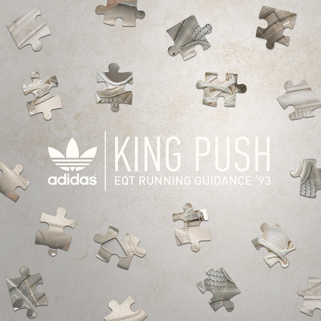 Ce choix de coloris est plutôt sobre mais la paire disposera néanmoins d’une belle association de matériaux comme du cuir craquelé et un autre façon peau de reptile. Son surnom, qui est le nom du prochain album de Pusha T, King Push, sera présent sur les lace-locks de cette adidas Equipment Guidance 93.