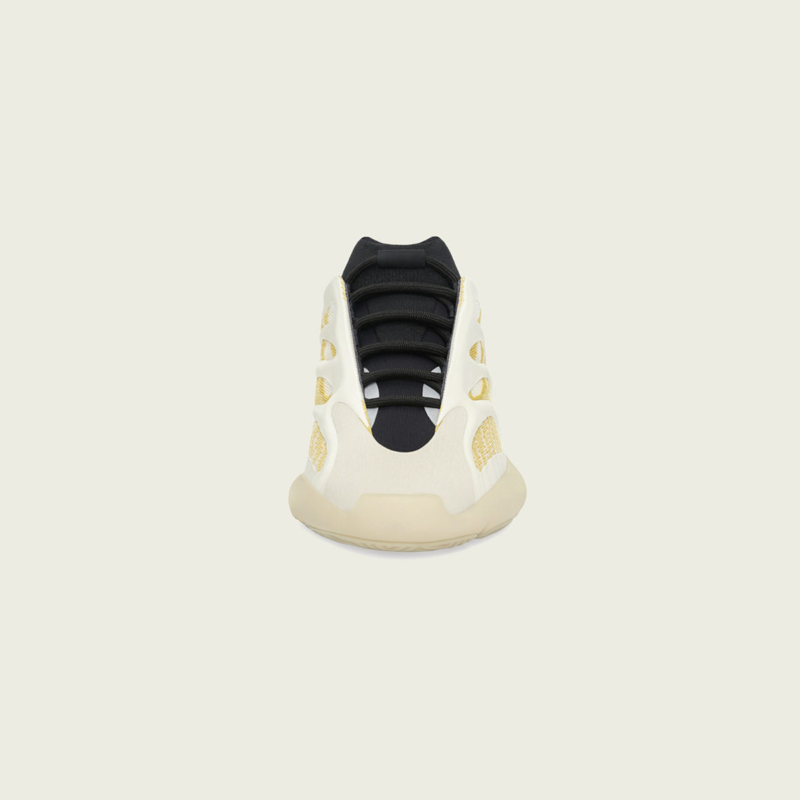 La Yeezy 700 V3 fait office d’OVNI dans le paysage de la sneaker. Sa construction atypique reflète la signature du rappeur et designer. Si le shape de la silhouette lui donne un look agressif, sa cage en TPU souple la transporte dans le futur et rend la sneaker reconnaissable au premier coup d’œil. Sur la déclinaison Safflower, la languette noire, solidaire de l’empeigne, est faite de néoprène. Elle supporte des lacets ton sur ton qui s’attachent via un lacelock cylindrique au look sobre. La cage caractéristique de la 700 V3 s’habille ici de blanc cassé et laisse apparaître un Primeknit traversé par des traits de couleur jaune-orange. Cette teinte dénommée Safflower, signifie Safran en français. La toebox est renforcée par un empiècement dont la nuance se situe entre celle de la cage et celle de la semelle. Cette semelle extérieure est présentée dans une teinte de beige clair et on retrouve le logo adidas au talon.