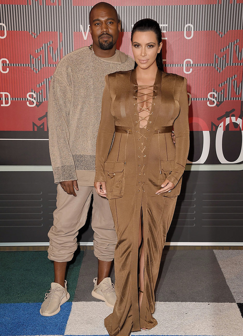 Kanye West a passé la soirée habillé avec les différentes pièces textiles de sa collection Yeezy Season 1 ainsi qu’avec une paire d’adidas Yeezy Boost 350 dans un coloris beige allant avec sa tenue.