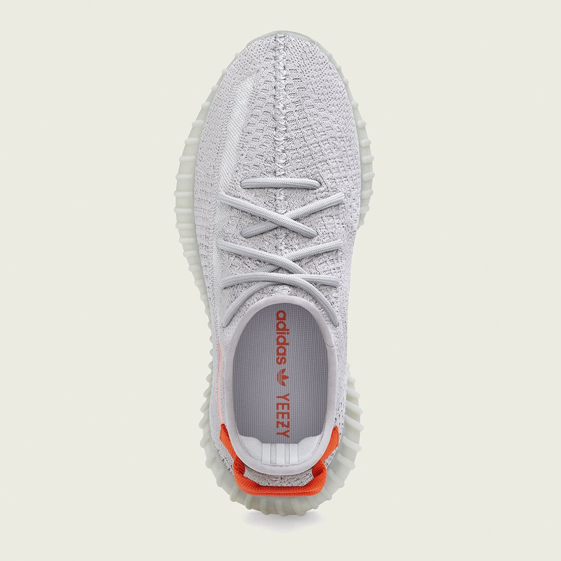 À mi-chemin entre les Yeezy Boost 350 V2 Beluga et Trueform, la chaussure se présente dans un code couleur gris uniforme. Le contraste est amené par la présence d’une touche orangée au talon, plus précisément sur le strap à l’arrière, qui se poursuit sur la barre graphique translucide. Le rendu voulu est celui des feux d’un véhicule qui freine, comme le prouve le surnom de la paire (« Tail Light »). La sneaker est toujours proposée dans son revêtement en Primeknit, entièrement gris tout comme la semelle à technologie Boost sur laquelle repose le modèle imaginé par Kanye West. La tige est d’ailleurs parsemée d’éléments de type 3M reflétant la lumière.