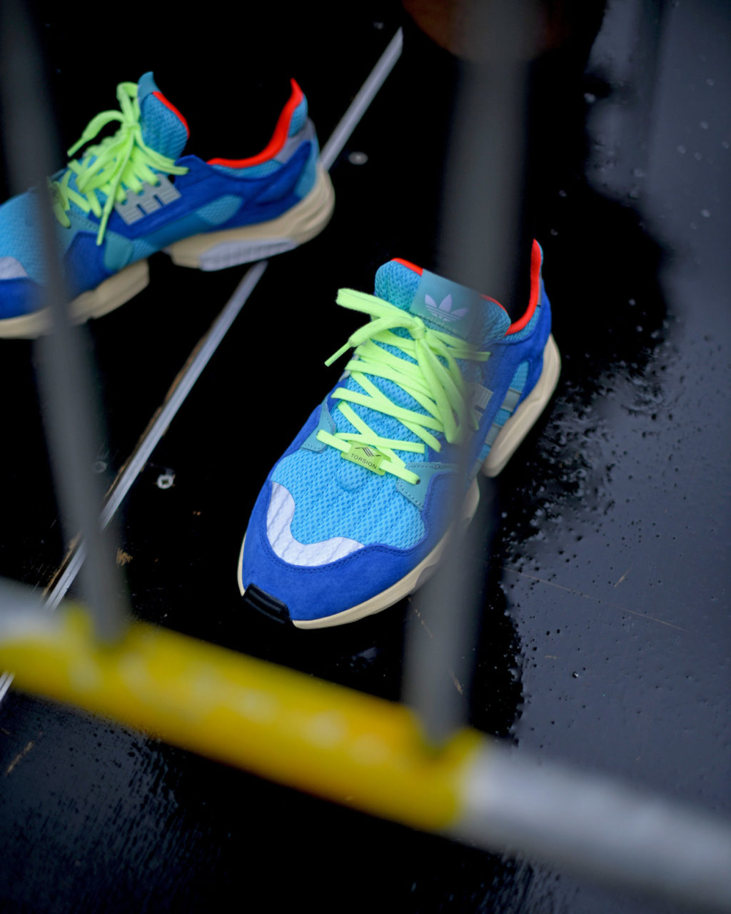 Les clichés révèlent un design unique et inspiré de plusieurs modèles du programme adidas. La construction associe des empiècements suédés avec des éléments en mesh, tandis que la semelle en Boost intègre la célèbre technologie Torsion. Le coloris Bright Cyan/Linen Green présenté ici est un clin d’œil au colorway « Aqua » de la mythique adidas ZX8000. Il se caractérise par une empeigne constituée deux différentes teintes de bleu et complétée par des lacets vert fluo. Les trois bandes adidas latérales, qui font aussi office de cage de maintien pour le système de laçage, sont ici grises. La doublure orange fluo contraste fortement avec l’ensemble et notamment la semelle intermédiaire volontairement jaunie pour le côté rétro. L’esprit vintage est aussi caractérisé par le logo Trefoil sur la languette. Plusieurs éléments de type 3M sont également disséminés au talon et sur la toebox afin de finaliser le look de cette nouveauté.