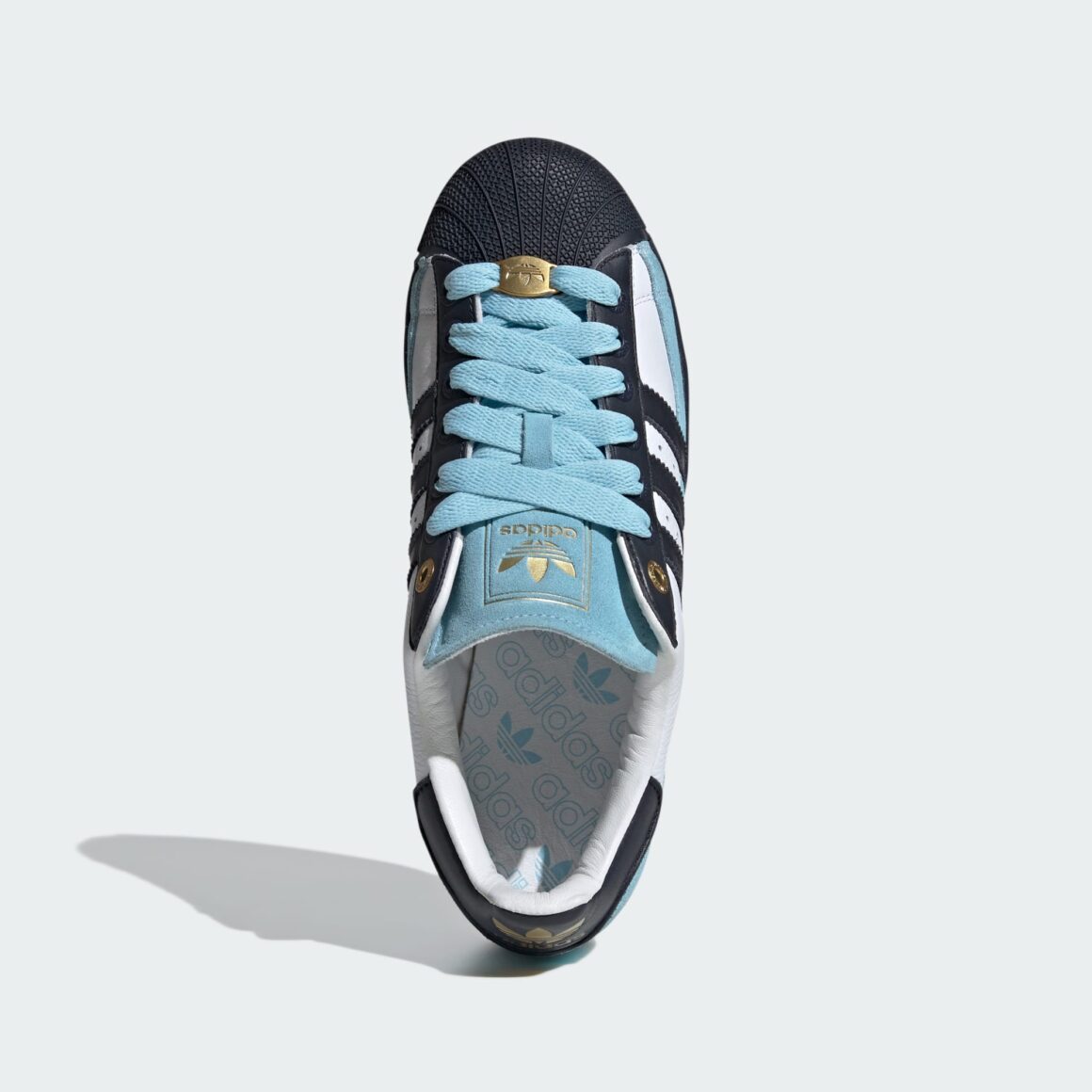 Cette AFA x adidas Superstar Argentina Home s’éloigne du noir/blanc classique de la Superstar pour adopter une palette directement inspirée du maillot domicile de la sélection argentine. La tige basse est construite en cuir blanc, visible sur les panneaux latéraux. La base de l’empeigne est en cuir suédé bleu ciel, que l’on retrouve sur la languette. Cette dernière est surmontée de logos trèfle doré, assortis aux deubrés. Du cuir marine habille les passages de lacets, ainsi que les trois bandes latérales. Il rappelle la coque en TPU sur la toebox. La paire repose sur une semelle intermédiaire marine ainsi que sur une semelle extérieure bleu ciel légèrement translucide. La sneaker vient accompagnée de trois paires de lacets, marine, blanc et bleu ciel. Un hangtag à l’effigie de l’AFA vient signer cette interprétation nouvelle de la Superstar.