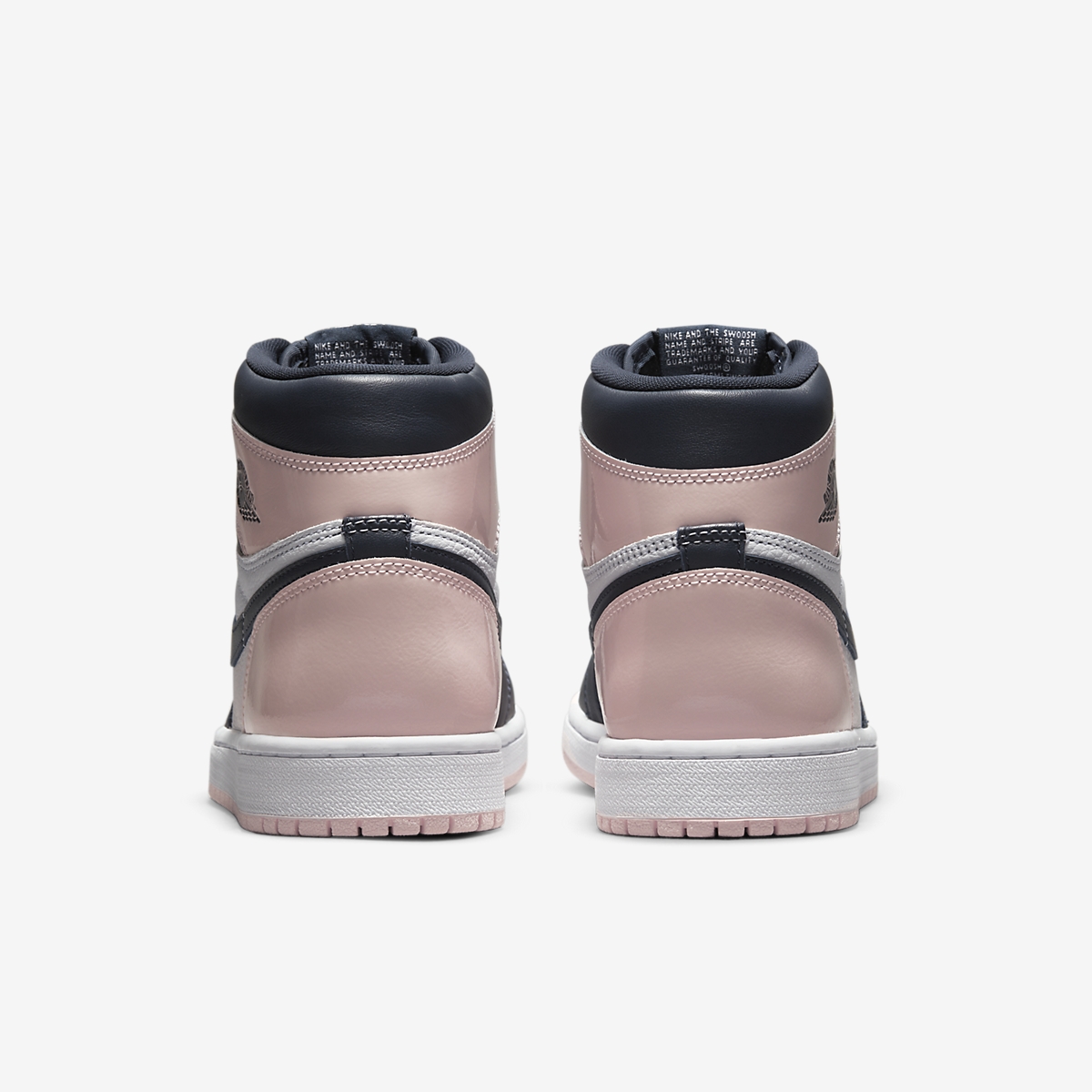 Cette Jordan 1 Atmosphere Bubble Gum respecte le triptyque chromatique commun aux meilleurs coloris de Jordan 1. L’empeigne en cuir s’habille de cuir blanc sur les panneaux latéraux et se voit renforcée par des empiècements marine sur le garde-boue avant et les passages de lacets. C’est sur la toebox, le col de cheville et le talon que l’on retrouve un cuir rose pâle avec un léger effet irisé, qui donne son nom au modèle. Un Swoosh marine contraste avec le blanc latéral. Reposant sur une semelle intermédiaire immaculée, la Bubble Gum possède une semelle extérieure rose. On retrouve un détail faisant un clin d’oeil au nom du coloris : une tache rose fluo figure sur la semelle extérieure du pied gauche, représentant un chewing-gum collé. Ornée du Wings Logo, la paire porte déjà tous les codes pour en faire un classique.