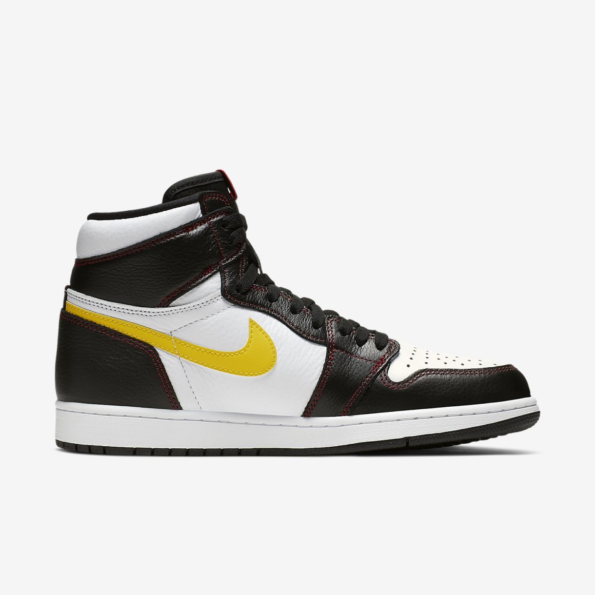 Cette édition exclusive de la sneaker emblématique est aujourd’hui présentée dans une empeigne à l’allure de prototype. La sneaker arbore une mouture sobre en cuir noir et blanc sur laquelle on distingue de jolies surpiqûres rouges. C’est le rendu donné aux Swoosh qui fait toute la particularité du modèle. En effet, cela donne l’impression qu’ils ont été décousus, comme sur une paire ayant été customisée. Des coutures effilochées de couleur rouge forment l’habituelle virgule Nike. Sur la partie intérieure du pied gauche, on retrouve un Swoosh en cuir jaune qui nous rappelle fortement celui de l’Air Jordan 1 Tour Yellow. Par ailleurs, la semelle de propreté fait aussi un clin d’oeil à cette teinte. Pour finir, le logo Nike Air et le fameux Air Wings sont surpiqués en rouge.