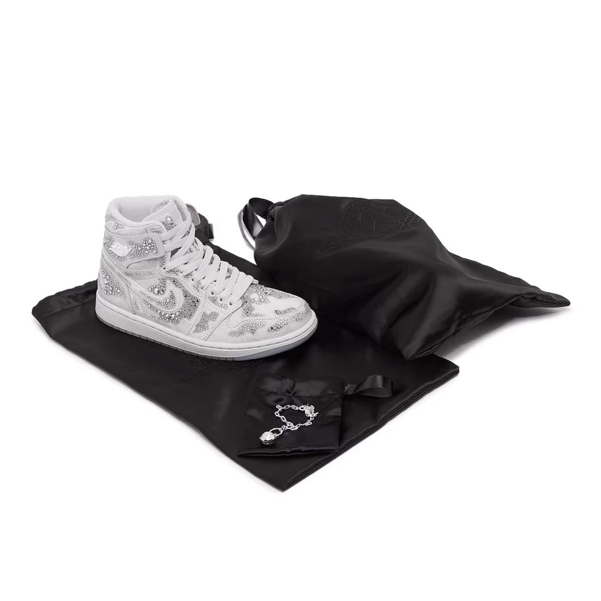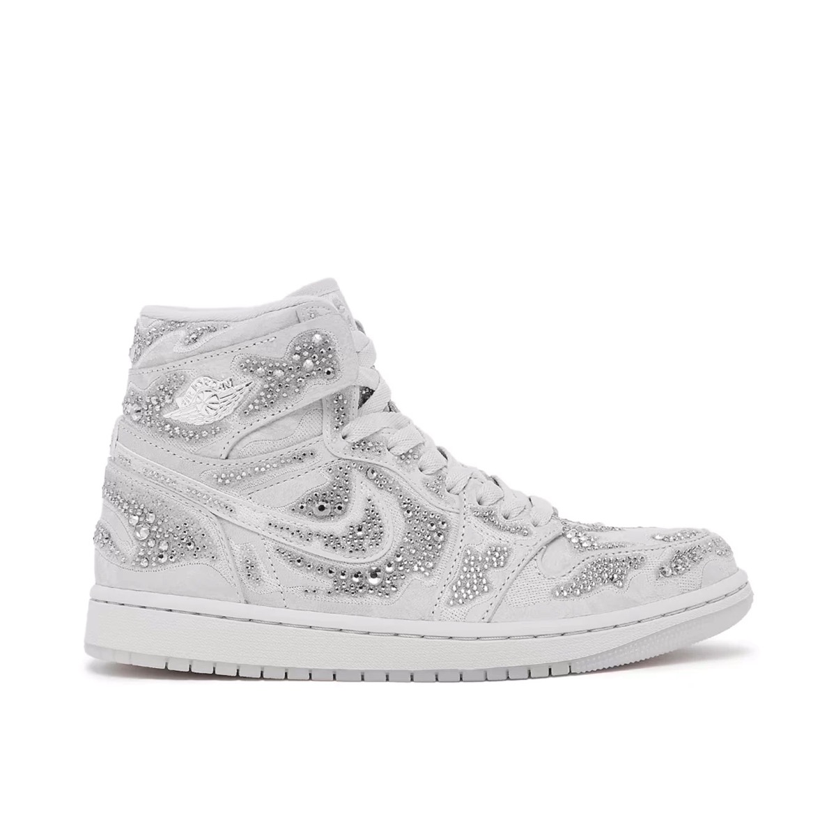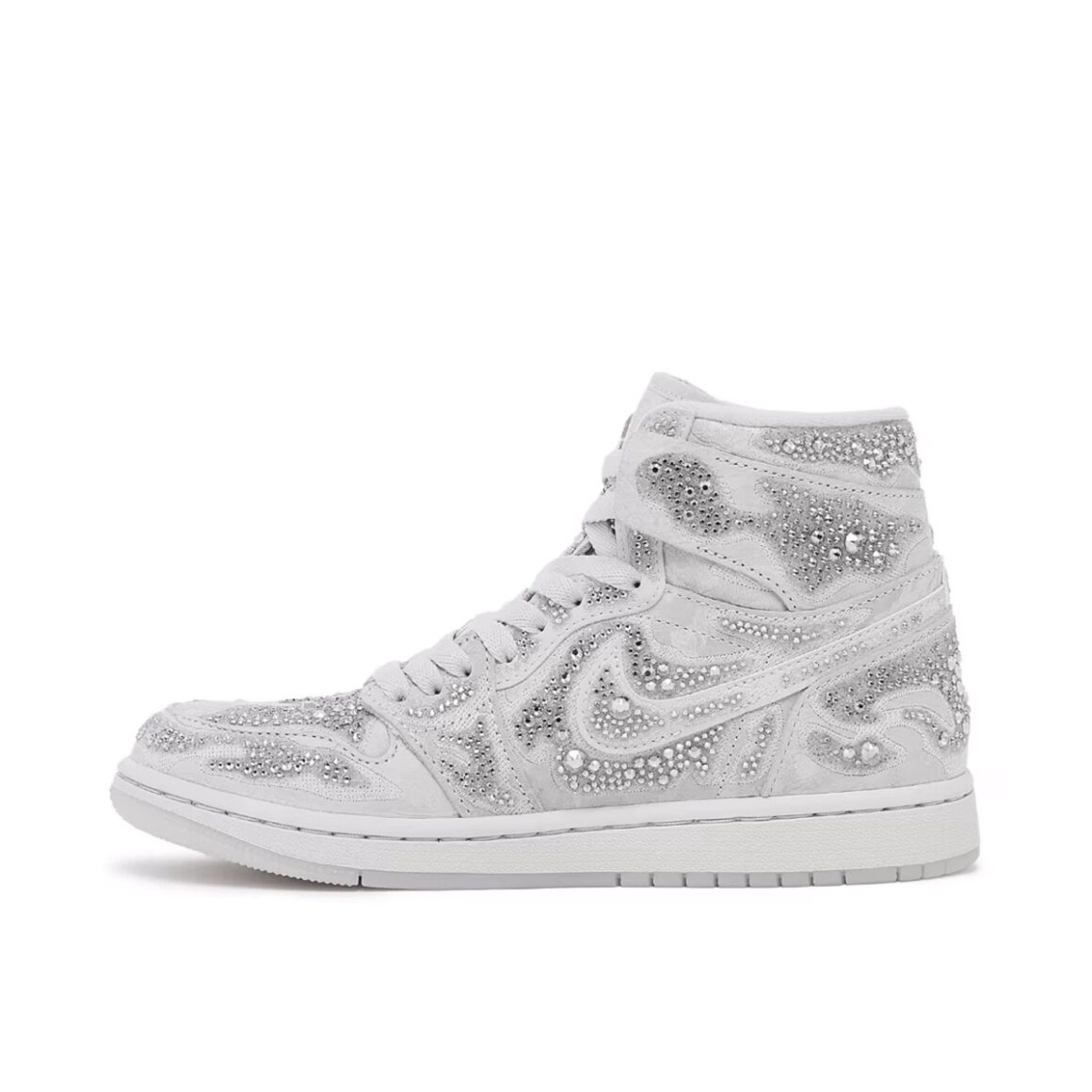 La structure de base de la Air Jordan 1 High OG Swarovski reste fidèle à l’originale : la silhouette haute reconnaissable entre toutes, un col bien rembourré pour un maintien optimal, une tige en cuir de qualité et la semelle emblématique qui a fait le succès du modèle pendant des décennies. Cette version ne cherche pas à bouleverser ces fondations, mais plutôt à les enrichir. Les lignes rigides et sculptées de la Air Jordan 1 High OG offrent une toile idéale pour accueillir des matériaux et des détails haut de gamme. Là où la sneaker traditionnelle propose des superpositions en cuir coloré, cette édition joue sur des textures et des accessoires soigneusement sélectionnés pour évoquer le luxe sans jamais trahir l’ADN sportif de la silhouette.