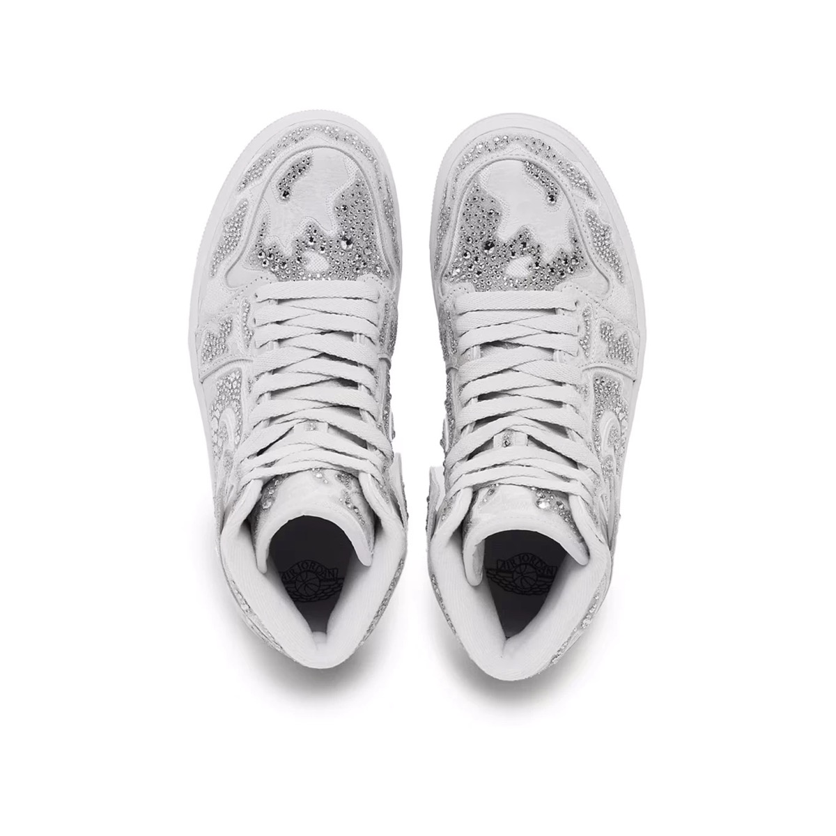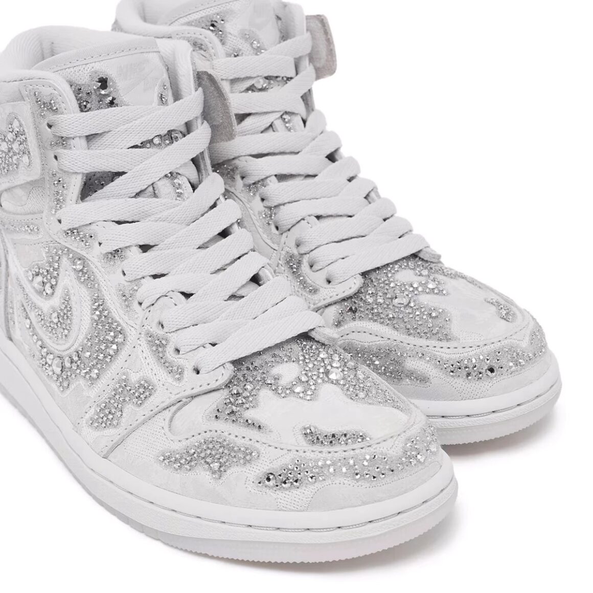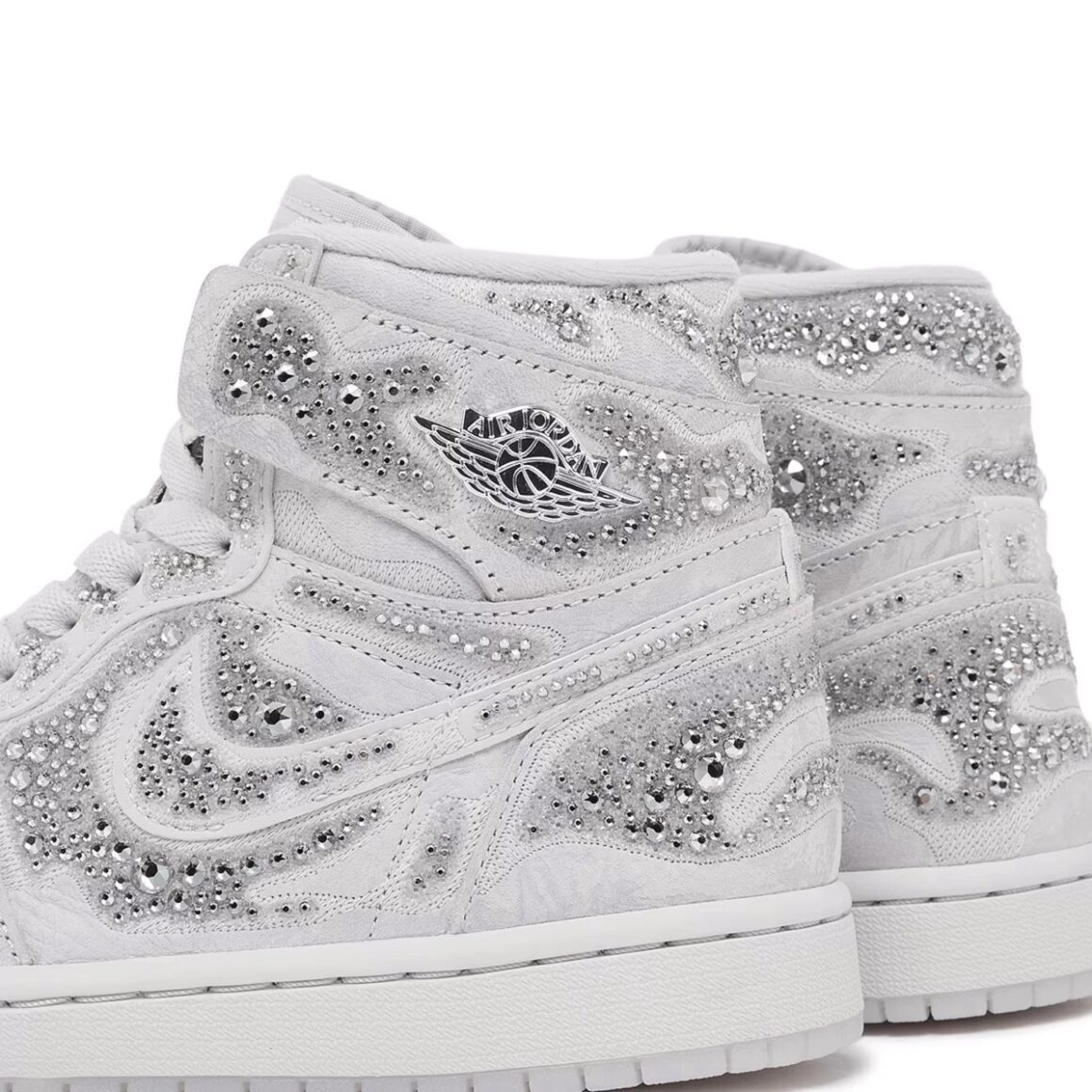 Ce qui distingue cette Air Jordan 1 High OG Swarovski, c’est bien sûr l’intégration de cristaux Swarovski dans son traitement esthétique. Plutôt que de se limiter à un simple logo incrusté ou à un panneau clinquant, Jordan Brand et Swarovski ont opté pour une approche plus subtile et harmonieuse. Les cristaux viennent orner certaines parties clés de la sneaker, transformant ces zones en points lumineux qui captent la lumière et attirent le regard. La base choisie, totalement blanche, harmonise parfaitement l’éclat des cristaux avec la texture du cuir et du mesh utilisés ailleurs sur la paire. Cela donne une sensation de luxe discret, un effet chic sans ostentation qui élève l’apparence globale de la sneaker. Le placement des cristaux donne à la paire une allure déconstruite, accentuée par l’utilisation de cristaux de différentes tailles. Les classiques Wing logos sont argentés, tandis que la semelle est totalement immaculée.