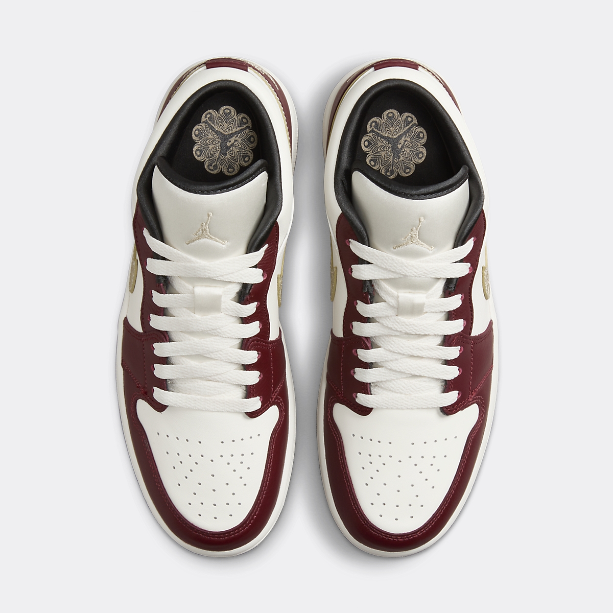 La Air Jordan 1 Low Chinese New Year 2024 s’inspire du dragon pour s’habiller de couleurs et de matériaux aux allures luxueuses. La base de la silhouette basse est construite en cuir blanc cassé. Il habille la toebox perforée, les panneaux latéraux, le col de cheville, ainsi que la languette. Celle-ci est brodée d’un Jumpman crème et liserée de tissu anthracite satiné. On le retrouve sur le sockliner, pour un contraste élégant avec les couleurs claires de l’empeigne. Du cuir bordeaux pare les passages de lacets, ainsi que les grades-boues avant et arrière de la paire. Ce dernier affiche une broderie Wings logo crème. Pour signer l’affiliation de la paire avec la créature légendaire, les Swoosh latéraux dorés arborent des écailles de dragon, que l’on retrouve également sur la semelle intérieure, accompagnées d’un Jumpman. La paire repose sur une semelle intermédiaire blanche, et une semelle extérieure grise, légèrement translucide. Cette Air Jordan 1 vient accompagnée d’un hangtag argent reprenant le motif de la semelle intérieure, ainsi que d’une enveloppe rouge, typique des célébrations du nouvel an chinois. Une special box dorée finalise ce design exclusif de Jordan Brand.