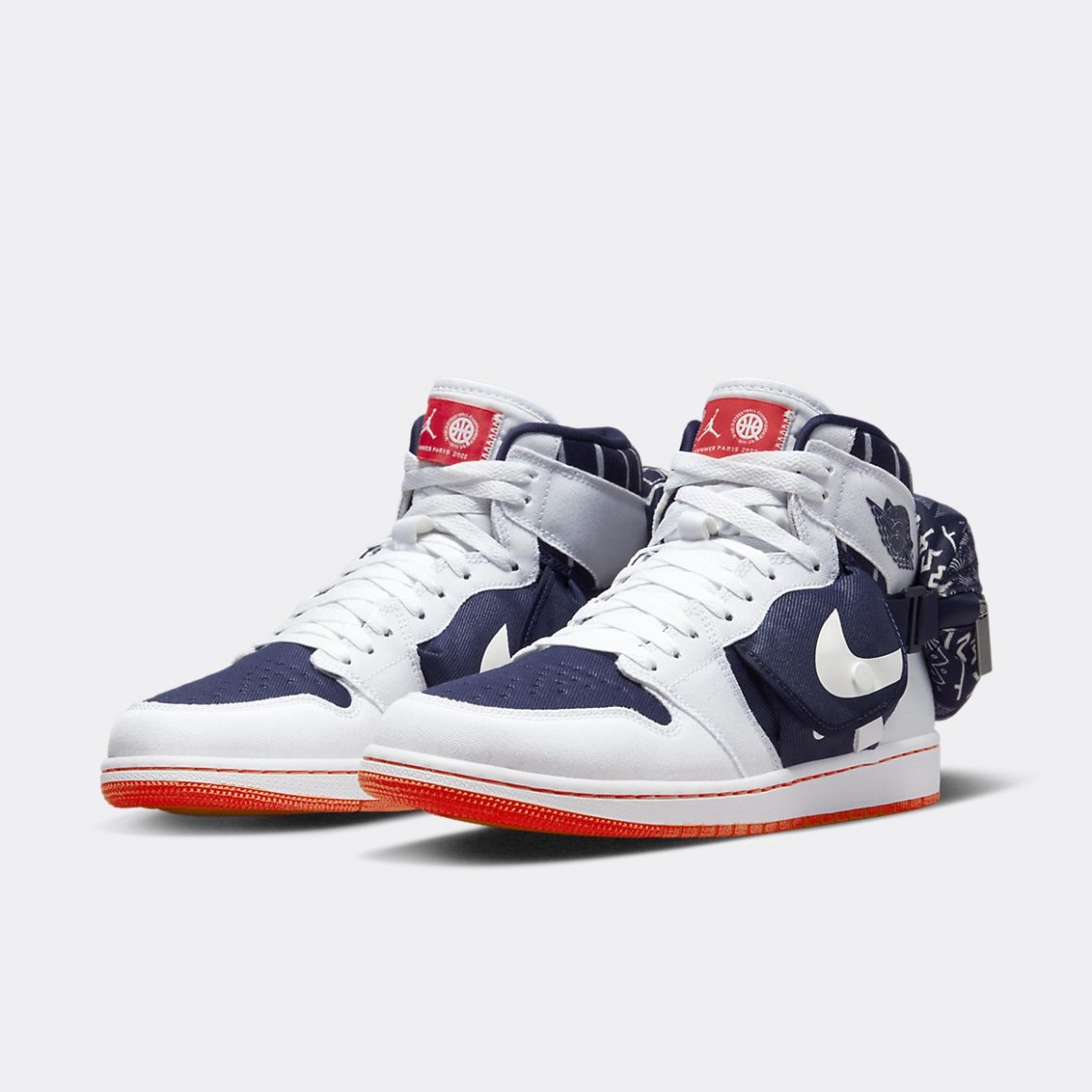 La silhouette semi-montante de la Air Jordan 1 Mid Quai 54 se pare de canvas et s’inspire des modèles Utility pour sa construction. La toebox et les panneaux latéraux indigo contrastent avec les gardes-boues et les passages de lacets immaculés. L’inspiration Utility s’incarne dans les petites poches sur les côtés extérieures et intérieures de la paire, traversées par un Swoosh blanc. Le Wings Logo marine sur fond blanc rappelle les rayures blanches imprimées sur le col de cheville indigo. La languette immaculée est surmontée d’une étiquette orange vif, qui s’accorde à la couture de la semelle intermédiaire, ainsi qu’à la semelle extérieure. Le talon de cette sneaker exclusive porte une pochette bleue zippée dégrafable, imprimée de motifs d’inspiration africaine.