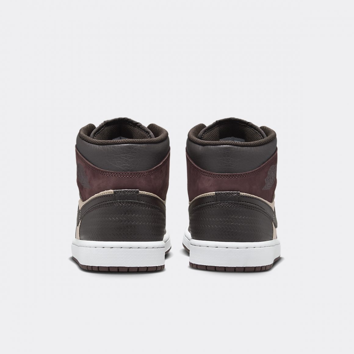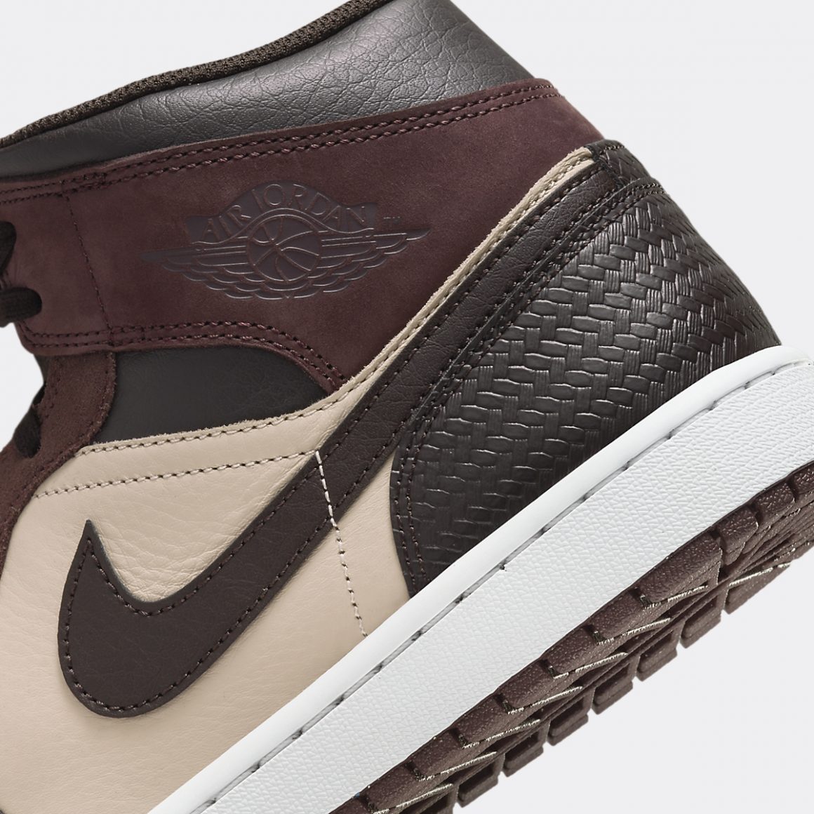 La silhouette semi-montante de la Air Jordan 1 Mid SE Paris YMCA s’inspire du lieu situé rue de Trévise, et en retranscrit les couleurs dans sa construction. La base de l’empeigne est en cuir beige, visible sur la toebox perforée et les panneaux latéraux. Ils s’accordent à la languette en mesh balistique. Celle-ci porte des lacets plats chocolat et une étiquette en cuir assorti, imprimée d’un Jumpman beige. La texture du cuir reprend les chevrons du parquet du mythique terrain et les retranscrit également sur le garde-boue arrière. Son homologue avant est en cuir lisse bordeaux, rappelant le cuir suédé des passages de lacets et du renfort du col de cheville. Ce dernier est gaufré d’un Wings logo et renforce le cuir chocolat du col de cheville. Ce même cuir habille les Swoosh latéraux et contraste avec la semelle intermédiaire immaculée. Une semelle extérieure marron finalise ce design en hommage au plus vieux court du monde.