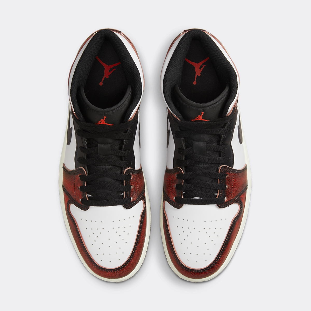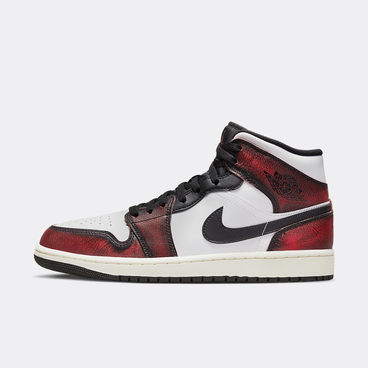 La silhouette semi-montante de la Air Jordan 1 Mid Wear-Away Chicago se pare de cuir sur l’ensemble de la tige. La base immaculée apparaît visible sur la toebox perforée, le col de cheville et les panneaux latéraux, ornés d’un Swoosh noir. Les gardes-boues, ainsi que le renfort de la cheville se parent d’un cuir rouge, liseré de noir. Sa construction imite la teinture de Rodman. Les passages de lacets en cuir noir sont assortis aux lacets plats et à la languette en Nylon. Celle-ci porte une broderie Jumpman rouge à son sommet. Cette itération inédite de la Air Jordan 1 Mid repose sur une semelle intermédiaire blanc cassé et une semelle extérieure noire.