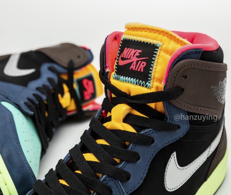 La chaussure, présentée dans sa forme montante, s’affiche dans une palette de couleurs rappelant à sa manière la sneaker sortie il y a 15 ans, bien que la disposition soit différente et que plusieurs couleurs manquent à l’appel. L’empeigne combine ainsi des teintes très variées : des éléments marron, noir, bleu turquoise et bleu marine. Le Swoosh latéral est proposé dans une version grise qui se démarque au premier coup d’œil. La teinte verte de la semelle intermédiaire est empruntée également à la Dunk tout comme la toebox bleue. Le patch sur la languette remplace le traditionnel Jumpman pour arborer le branding Nike Air, dévoilé sous la forme d’un autre patch dont les contours sont brodés et visibles. La languette évolue avec sa teinte jaune flashy et sa conception doublée. La doublure rose apporte une touche de piquant supplémentaire et renvoie au Swoosh du modèle sorti avec Undefeated, ainsi qu’à la doublure de cette nouvelle interprétation. L’intégralité de la sneaker est réalisée en suede pour offrir un rendu premium au modèle.