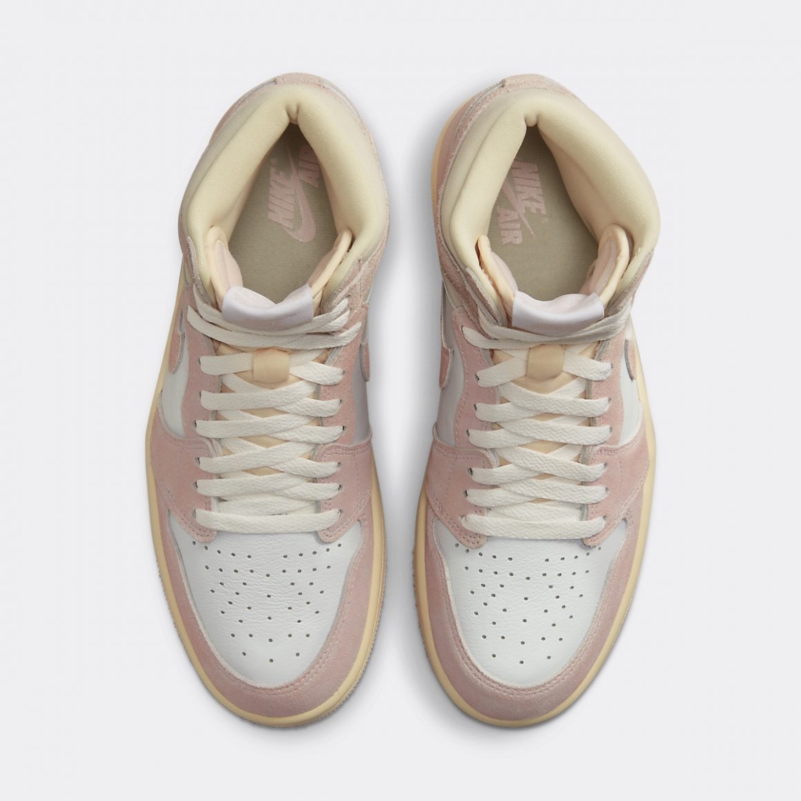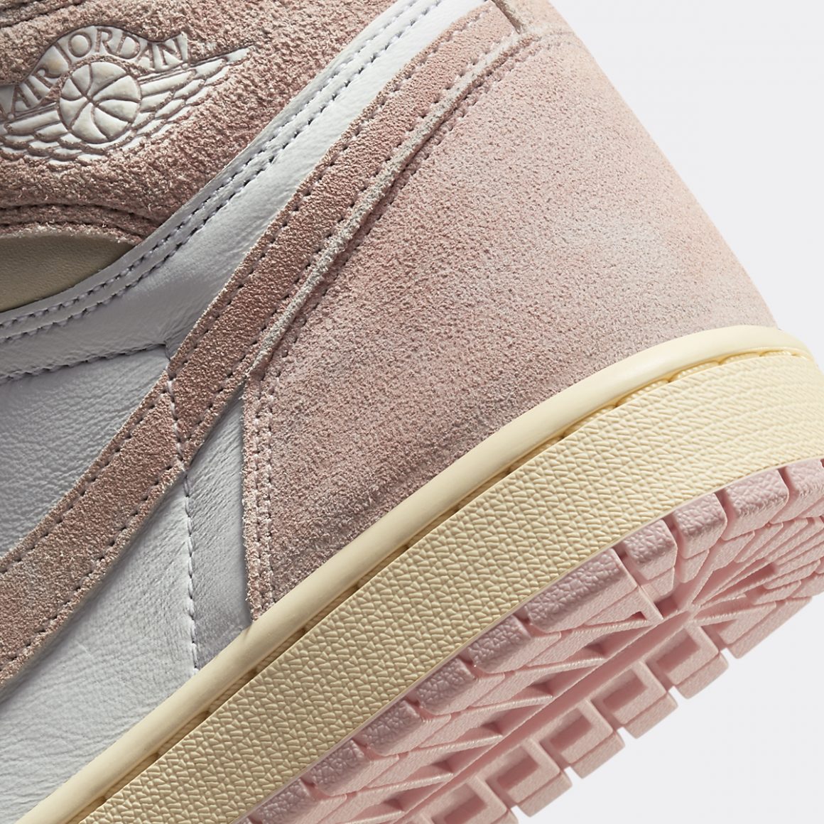 La silhouette montante de la Air Jordan 1 W Retro High OG Atmosphere bénéficie d’un traitement chromatique la rendant idéale pour la saison estivale. Sa base est construite en cuir blanc, visible sur la toebox perforée et les panneaux latéraux. Ce cuir devient beige sur le col de cheville, pour s’accorder au traitement vintage de la languette en mousse. Cette dernière est surmontée d’une étiquette blanche, au logo Nike Air rose pâle. Ce ton habille les empiècements de renfort de la tige. Ils sont construits en cuir suédé brossé légèrement délavé, et parent les gardes-boues avant et arrière, ainsi que les Swoosh latéraux, les passages de lacets et le renfort de cheville. Ce dernier est embossé d’un Wings logo blanc, assorti aux lacets plats. La paire repose sur une semelle intermédiaire blanc cassé, et une semelle extérieure rose vieux. Une seconde paire de lacets rose vient compléter ce design exclusivement féminin.