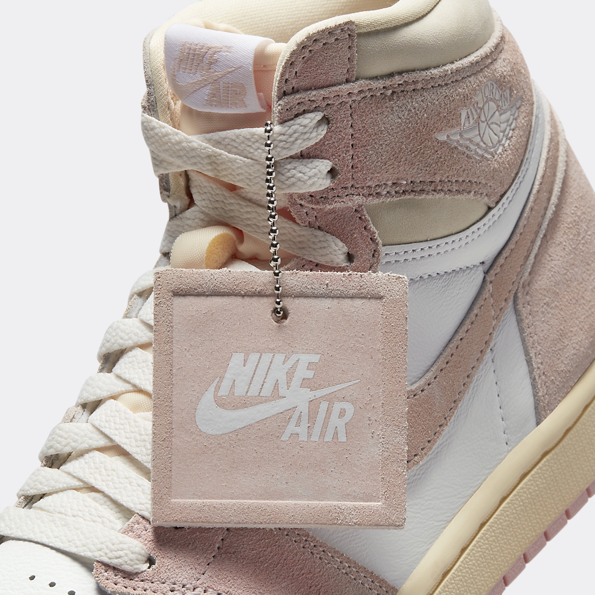 La silhouette montante de la Air Jordan 1 W Retro High OG Atmosphere bénéficie d’un traitement chromatique la rendant idéale pour la saison estivale. Sa base est construite en cuir blanc, visible sur la toebox perforée et les panneaux latéraux. Ce cuir devient beige sur le col de cheville, pour s’accorder au traitement vintage de la languette en mousse. Cette dernière est surmontée d’une étiquette blanche, au logo Nike Air rose pâle. Ce ton habille les empiècements de renfort de la tige. Ils sont construits en cuir suédé brossé légèrement délavé, et parent les gardes-boues avant et arrière, ainsi que les Swoosh latéraux, les passages de lacets et le renfort de cheville. Ce dernier est embossé d’un Wings logo blanc, assorti aux lacets plats. La paire repose sur une semelle intermédiaire blanc cassé, et une semelle extérieure rose vieux. Une seconde paire de lacets rose vient compléter ce design exclusivement féminin.