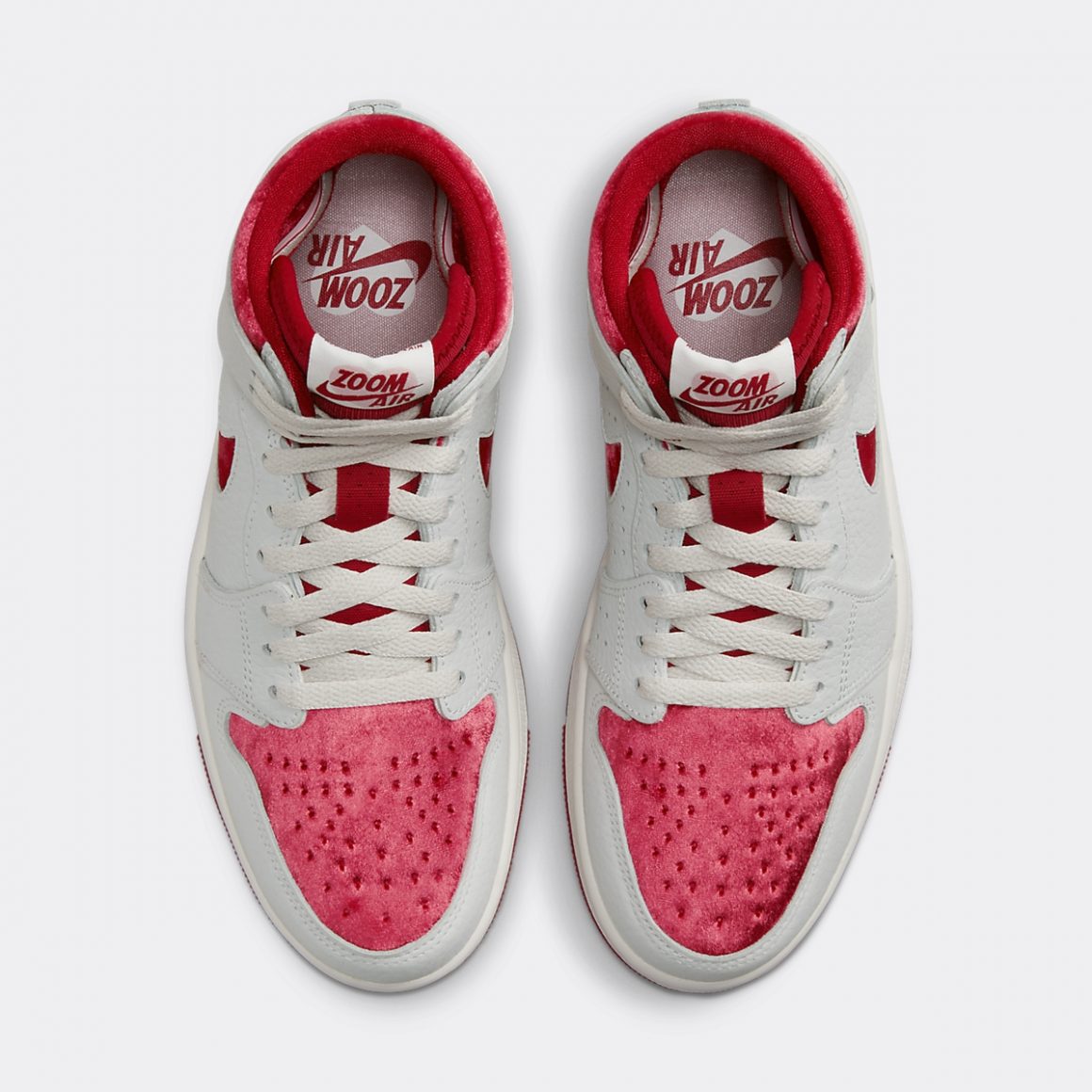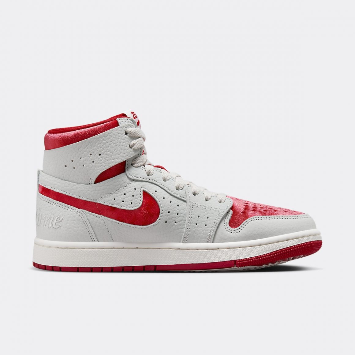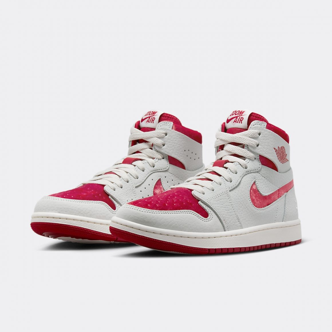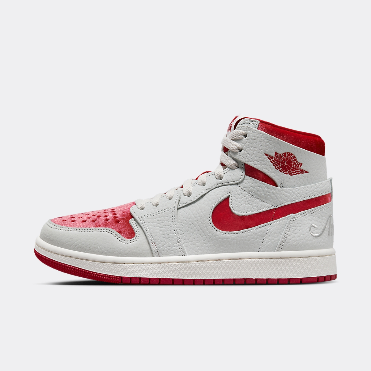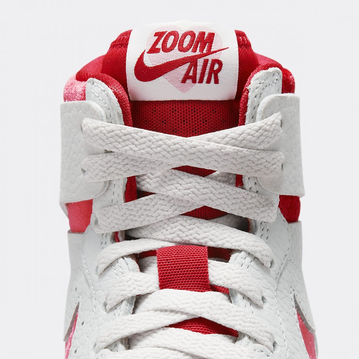 La Air Jordan 1 Zoom CMFT 2 Valentine’s Day reprend la silhouette de la classique Air Jordan 1 High en y apportant son lot de nouveautés technologiques, toutes destinées à améliorer le confort de la paire du meilleur numéro 23 du monde. Les matériaux utilisés la rendent plus légère et le support de cheville rembourré permettent d’avoir une paire plus facile à enfiler. Cette itération Valentine’s Day se pare de cuir grainé blanc gris, visible sur les gardes-boues avant et arrière, les panneaux latéraux et le col de cheville, embossé d’un Wings logo rouge. Ce rouge habille du velours brillant sur la toebox, le col de cheville et le Swoosh latéral. La languette assortie est surmontée d’une étiquette Zoom Air avec un cœur en fond. Ce logo se retrouve également imprimé sur la semelle intérieure. Le heeltab porte des broderies blanches Anytime Anywhere, s’accordant ainsi à la semelle intermédiaire. Cette dernière repose sur une semelle extérieure rouge. La paire vient accompagnée de trois paires de lacets, blancs, rouges et noirs, ainsi que d’une special box blanche, ornée d’un Wings logo rouge.