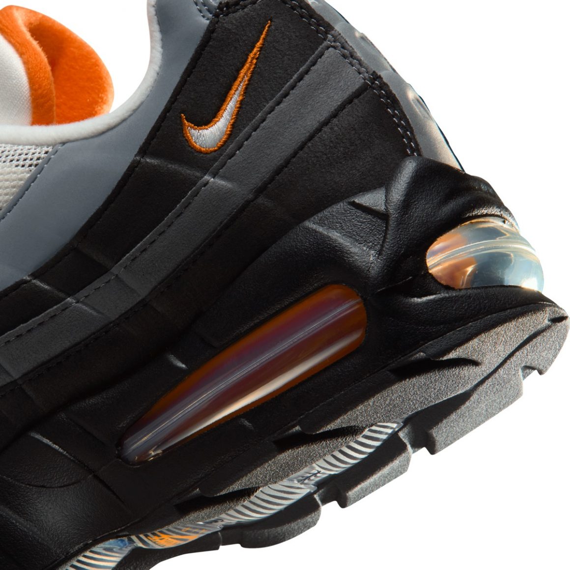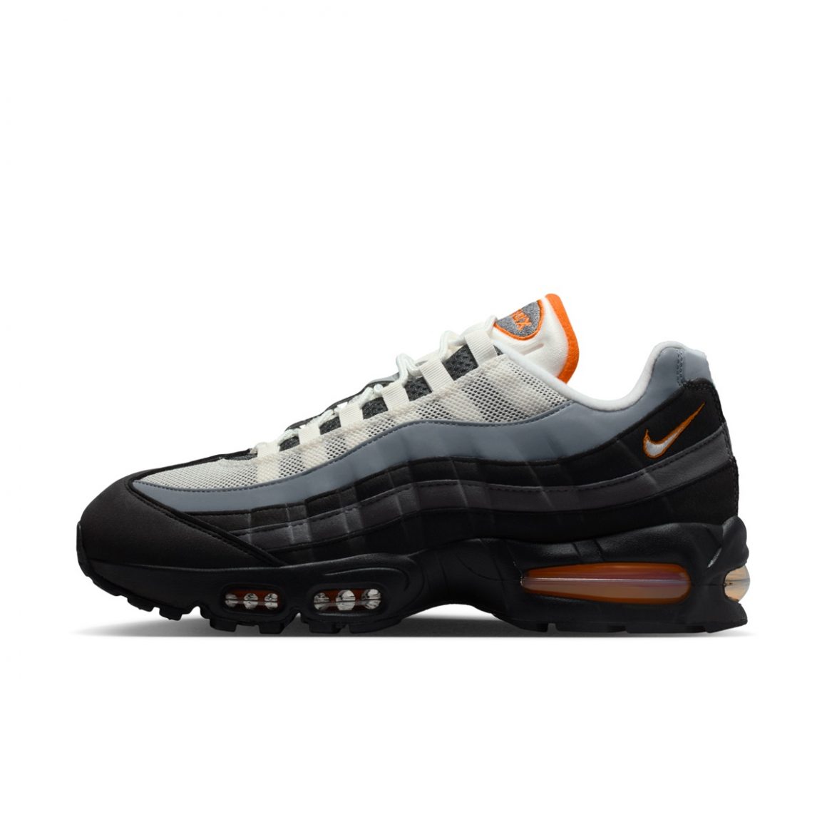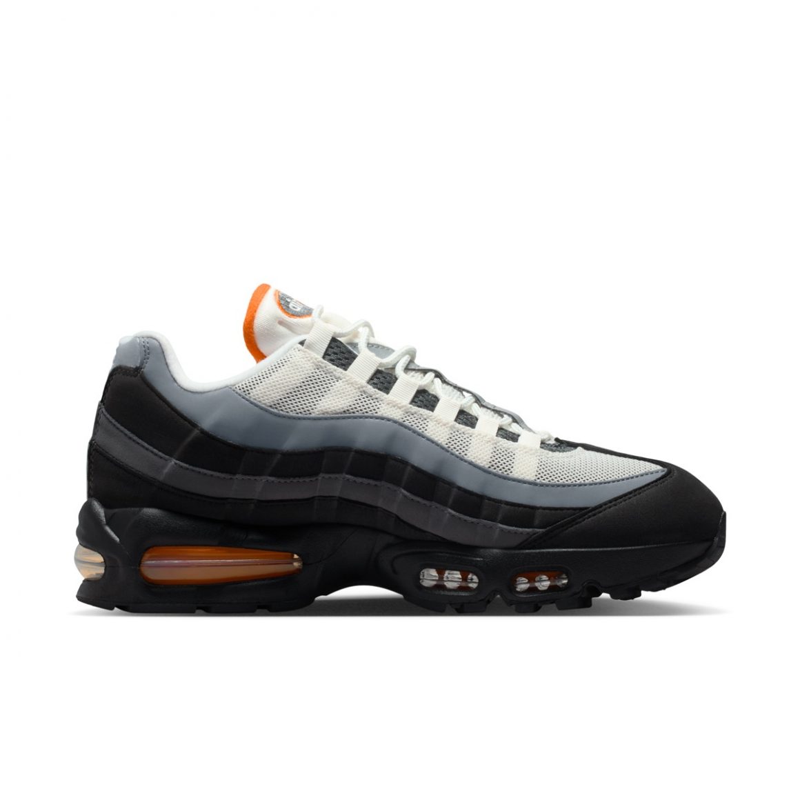 Lorsqu’elle est apparue en 1995, la Nike Air Max 95 a bouleversé les codes. Inspirée par l’anatomie humaine, avec une semelle représentant la colonne vertébrale, des couches latérales évoquant les muscles et un mesh figurant la peau, elle marquait un tournant audacieux pour Nike. La Nike Air Max 95 Bright Ceramic reprend cette architecture emblématique, tout en lui insufflant un souffle contemporain. La tige mêle différentes nuances de gris et de noir, organisées en dégradé horizontal caractéristique, créant un jeu d’ombres et de lumière qui accentue les volumes de la chaussure. Ce fond sobre met en valeur les accents Bright Ceramic, un orange brûlé éclatant qui vient électriser les détails clés : le liseré du mini Swoosh, ainsi que le logo Air Max sur la languette et les unités d’air visibles sous la semelle. Ce contraste confère à la paire une identité forte, entre élégance urbaine et agressivité mesurée. Le mesh respirant du dessus de la tige assure confort et maintien, tandis que les empiècements en cuir suédé ajoutent une texture riche et durable. Fidèle à son ADN running, cette Air Max 95 conserve sa semelle intermédiaire qui se pare de noir et ses bulles d’air apparentes à l’avant et à l’arrière, symbole d’amorti et d’innovation technique.