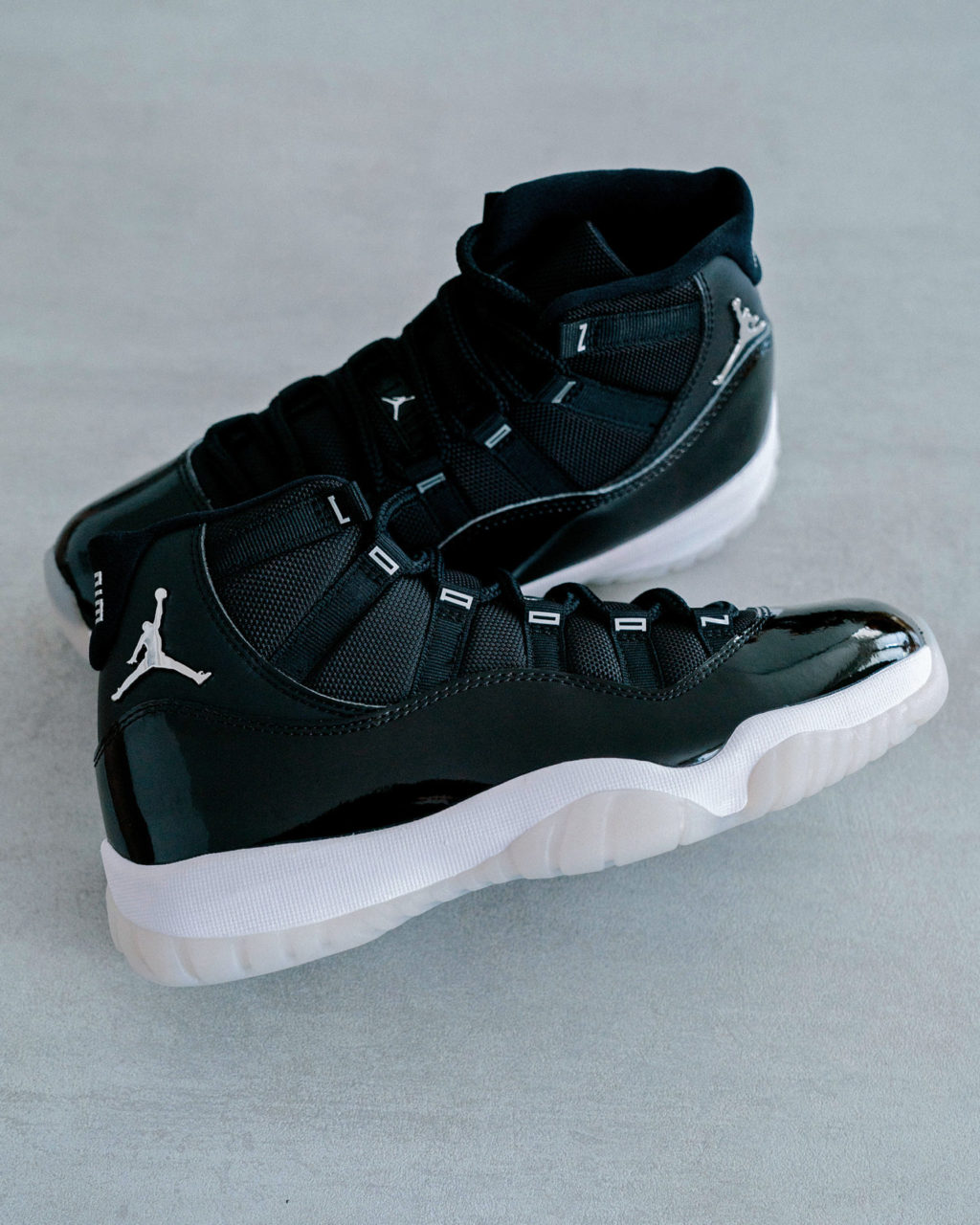 Sur l’empeigne de cette Jordan 11, on retrouve du mesh noir renforcé par un empiècement en cuir lisse ton sur ton. Le garde boue se pare d’un cuir vernis noir et donne un look cérémonial à la sneaker, lorsque couplé à la semelle intermédiaire blanche. Cette dernière repose sur une semelle extérieure translucide, marque de fabrique de ce modèle. De nombreux détails sont truffés dans la construction de cette paire. En plus du Jumpman en métal sur le côté arrière, des inscriptions argentées appairassent ici et là. Un numéro « 23 » au niveau du tendon d’Achille, un « Jordan » sur les passages de lacets et un mini Jumpman sur la languette. Pour signer l’anniversaire, on retrouve un « 25 » floqué sur la semelle intérieure. Enfin, cette Jordan 11 devrait disposer d’un packaging spécial.