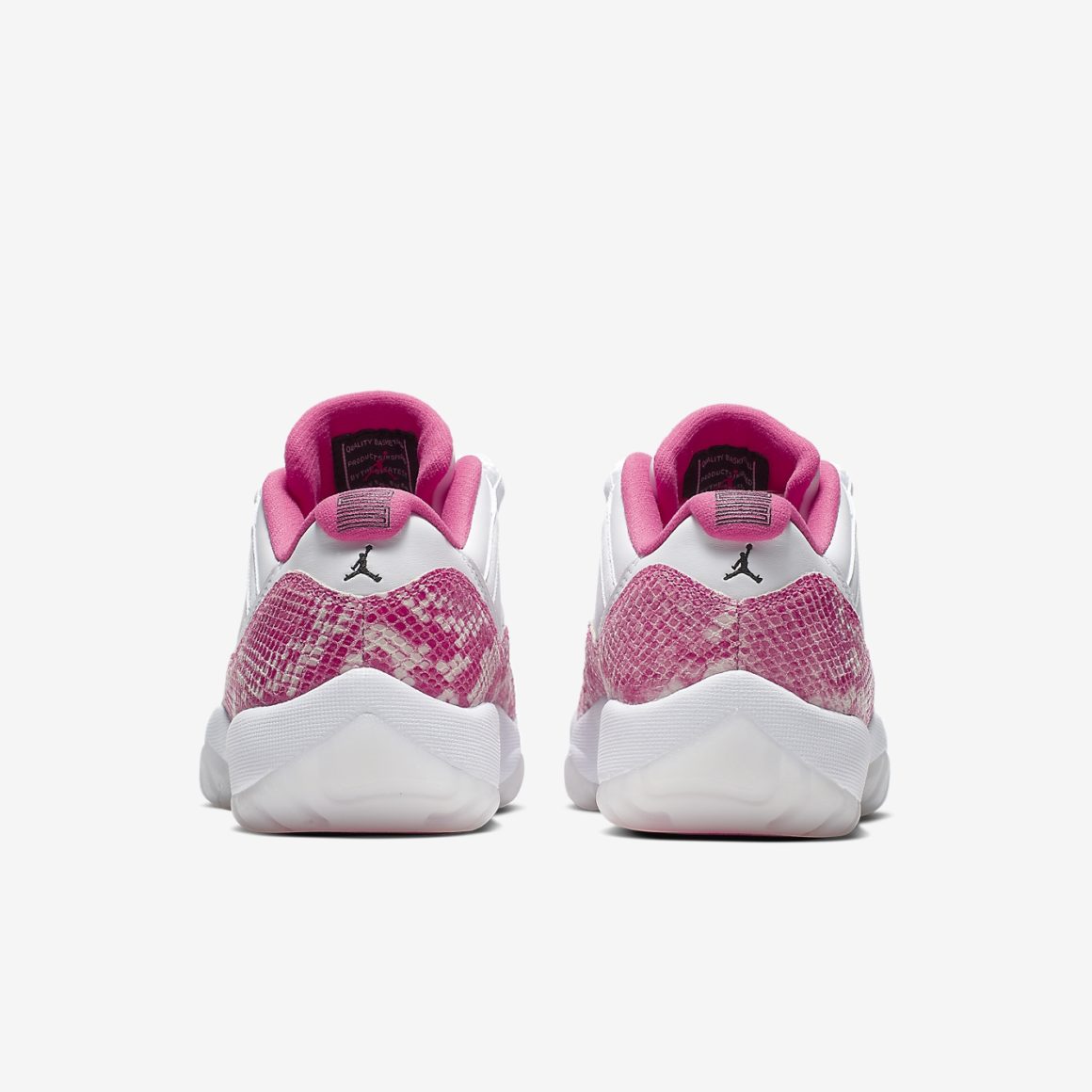Cette nouvelle sortie de la marque au Jumpman, proposée dans une version low, arbore un cuir blanc totalement mat sur lequel des empiècements pour lacer la paire sont superposés. Un cuir coloré habillé du fameux imprimé « serpent » vient contraster le modèle et y ajouter un peu d’excentricité. Contrairement à la précédente édition l’outsole est blanche semi-transparente et non bleue. Le célèbre logo « Jumpman » de la marque Jordan Brand est visible sur la semelle de propreté rose mais également au niveau du laçage et sur le talon de la paire. Un détail de plus est positionné sur le tab, le numéro 23, qui rend hommage au célèbre basketteur dont la marque porte le nom.