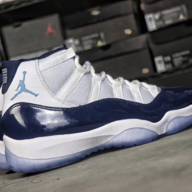 La toute première qui sortira est déjà surnommée Midnight Navy. On retrouve tous les attributs de l’emblématique modèle avec un upper en mesh, ici blanc, qui juxtapose des parties en cuir verni qui sont bleu marine. De petites touches de bleu clair (le bleu de UNC, University Blue) viennent agrémenter le modèle à divers endroits. Enfin les sneakers sont finies avec une semelle extérieure transparente.