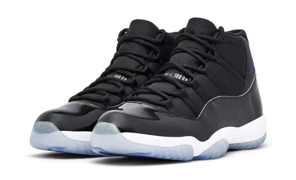 La Air Jordan 11 Space Jam se distingue par une palette chromatique simple mais extrêmement efficace. La base noire domine entièrement la tige, renforçant l’impression de profondeur et de sophistication. Le logo Jumpman apparaît en bleu, apportant une touche vibrante qui rappelle directement l’univers cosmique associé au film. La semelle translucide, légèrement bleutée, complète cette esthétique futuriste tout en offrant un contraste visuel fort avec la semelle intermédiaire blanche. Cette combinaison chromatique, restée quasiment inchangée au fil des décennies, explique en grande partie la longévité esthétique du modèle.