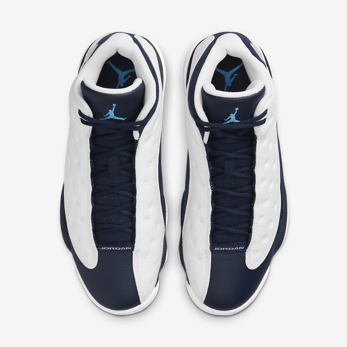 L’empeigne de la Air Jordan 13 Obsidian est composée de cuir blanc capitonné sur les côtés et de cuir grainé marine sur la toebox. Les lacets blancs parcourent une languette surmontée d’un Jumpman brodé bleu ciel. Le talon et la semelle intermédiaire sont recouverts d’un doux suède marine. Marque de fabrique de ce treizième modèle, la bulle verte en hologramme où Jumpman, numéro 23 et ballon de basketball se mêlent au gré des luminosités, se retrouve sur le côté arrière de la sneaker. La paire repose sur une semelle blanche en forme de patte de félin où la semelle extérieure est liserée de bleu ciel.